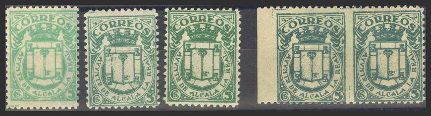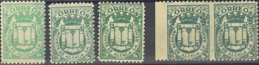 ★1937. 5 cts verde, tres sellos y PAREJA HORIZONTAL SIN DENTAR EN MEDIO. ALCALA LA REAL. MAGNIFICOS. (Fesofi 1/3, 1pha).