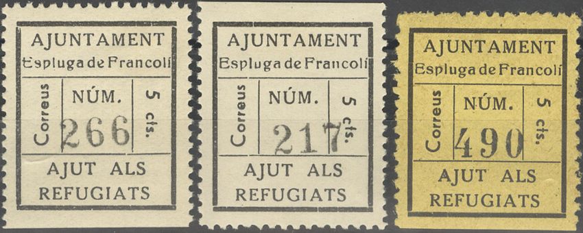 ★1937. 5 cts, tres sellos. ESPLUGA DE FRANCOLI. MAGNIFICOS. (Guillamón 561/62, 561a).