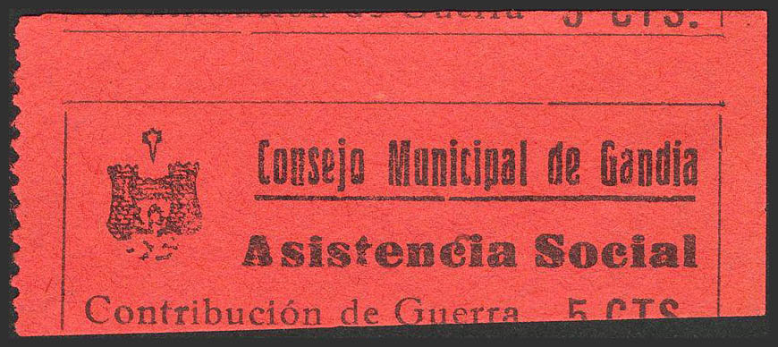 (★)1937. 5 cts negro sobre rojo. GANDIA. MAGNIFICO Y RARO. (Guillamón 629).