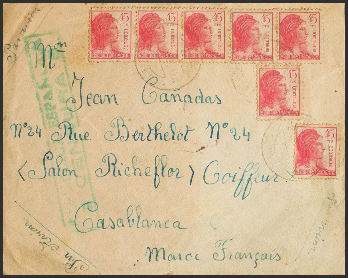 752(4). 1938. 45 cts rosa, siete sellos. Dirigida a CASABLANCA (MARRUECOS). Matasello CORREO DE CAMPAÑA / C.C. Nº10A, al dorso llegada. MAGNIFICA.