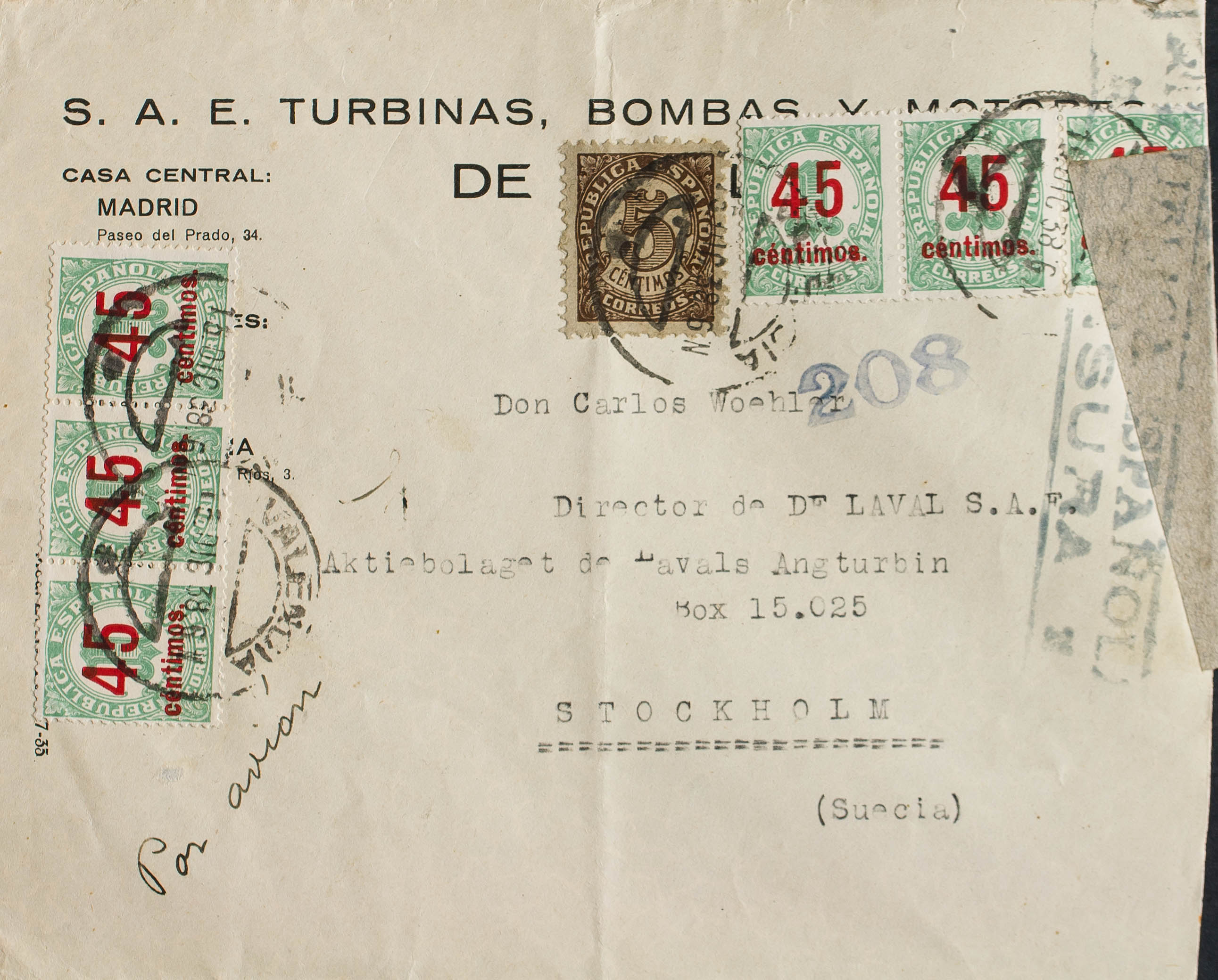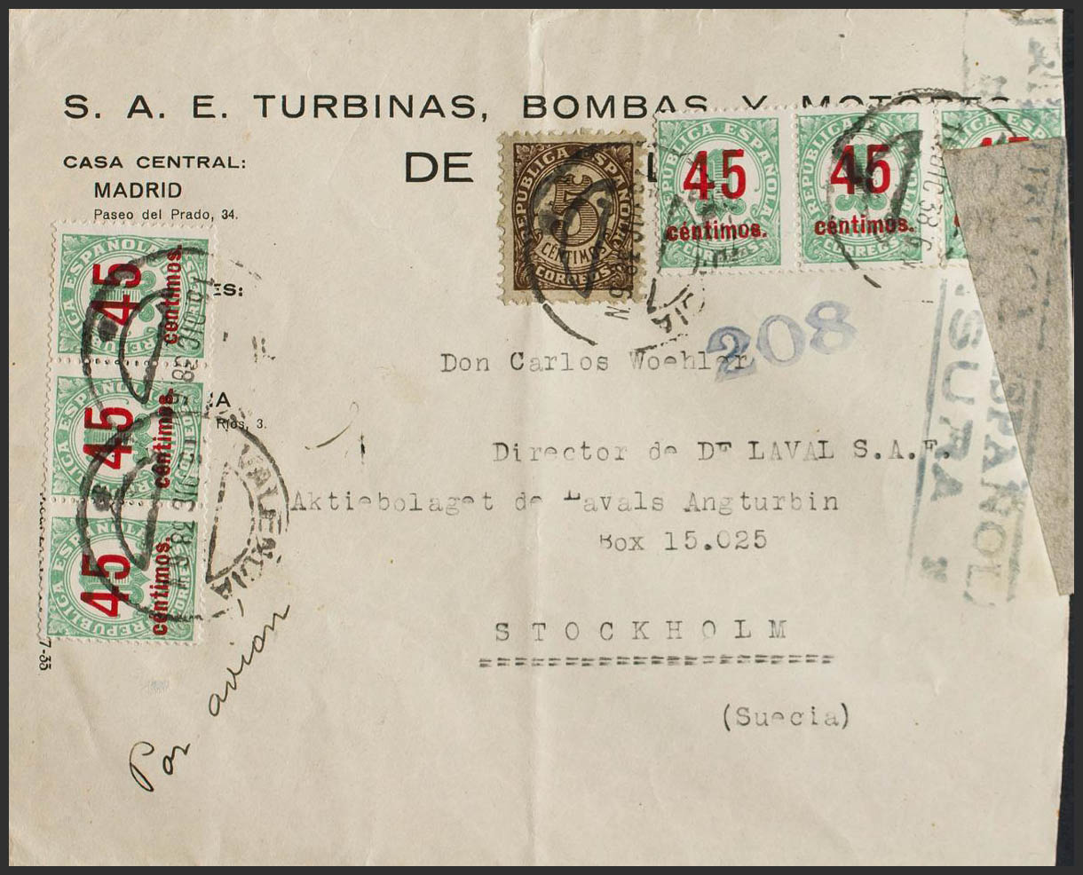 742(6), 745. 1938. 45 cts sobre 1 cts verde (dentado fino) y 5 cts castaño. VALENCIA a ESTOCOLMO (SUECIA). MAGNIFICA.