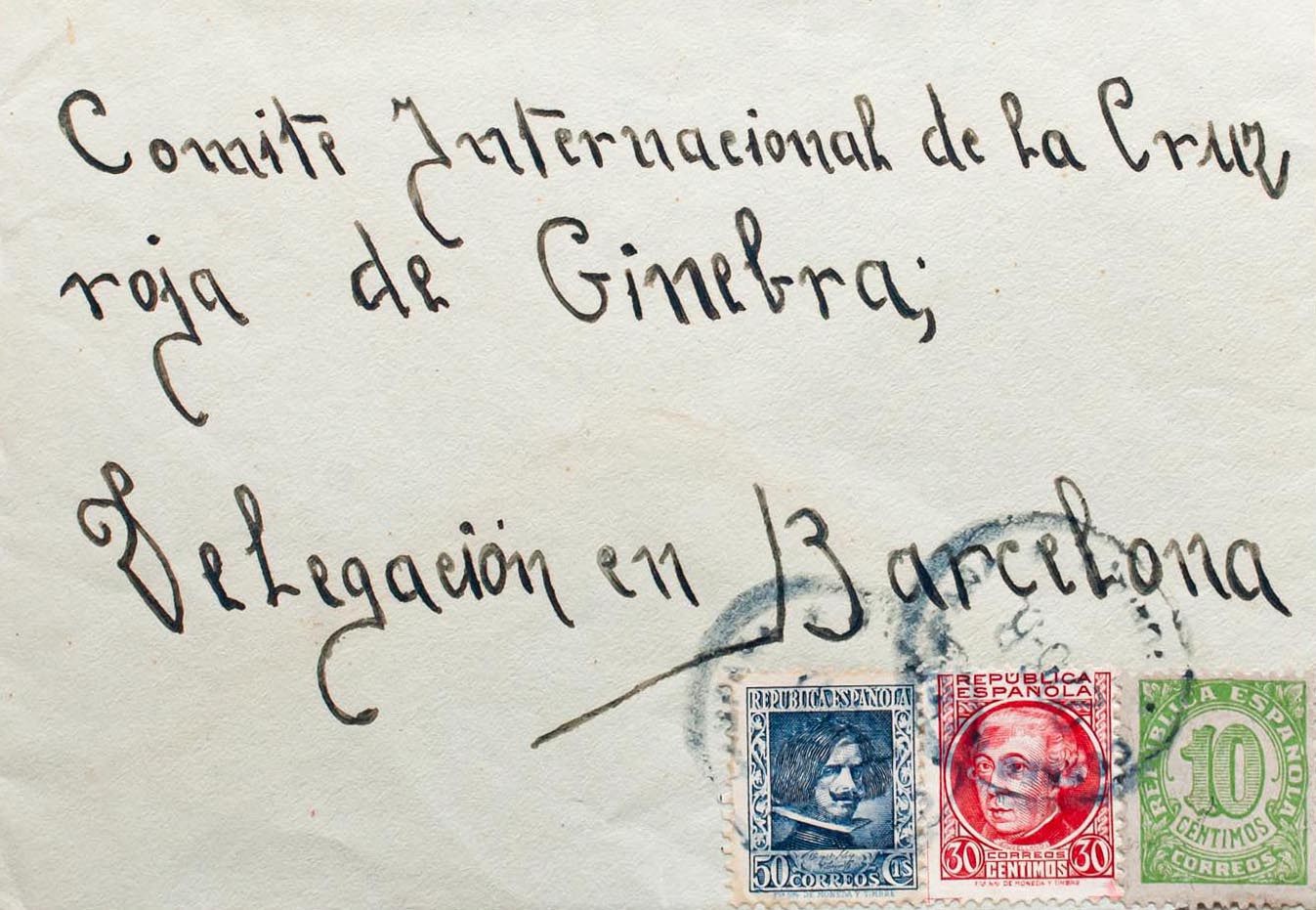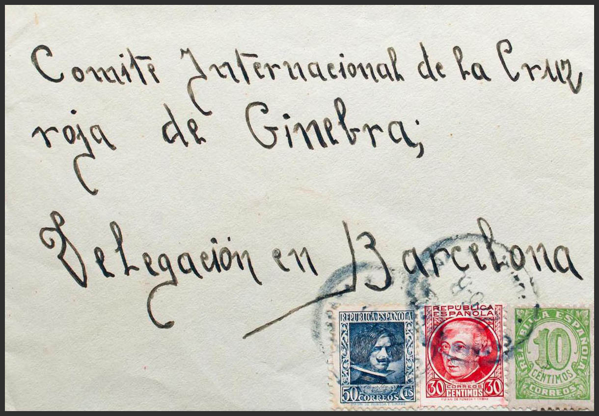 746, 687, 738. (1938ca). 10 cts verde, 30 cts carmín y 50 cts azul. Dirigida a BARCELONA. Matasello CORREO DE CAMPAÑA / 275-B / B. TURIA. MAGNIFICA.