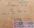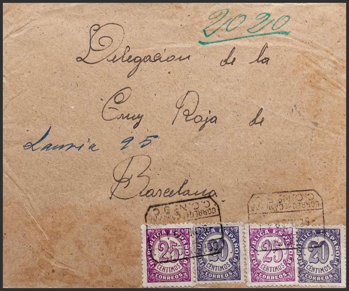 748(2), 749(2). 1938. 20 cts violeta, dos sellos y 25 cts lila, dos sellos. Certificado desde "el frente" a BARCELONA. Matasello CERTIFICADO / CORREO DE CAMPAÑA / C.C.Nº90. MAGNIFICA.