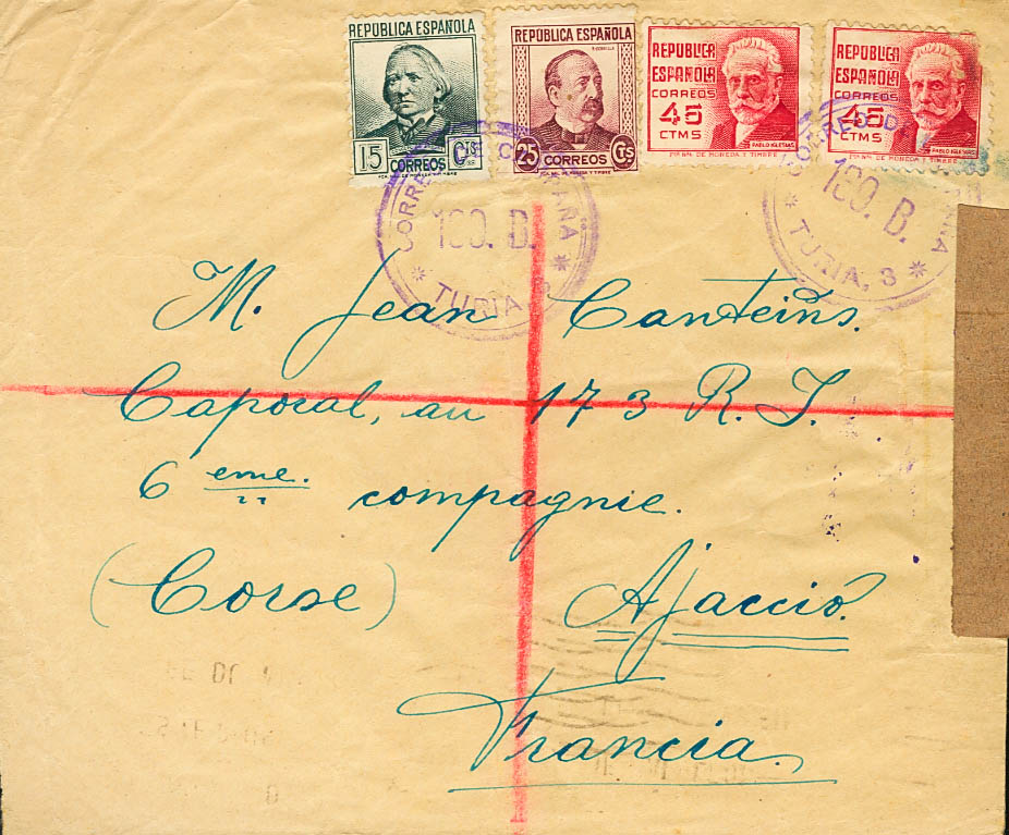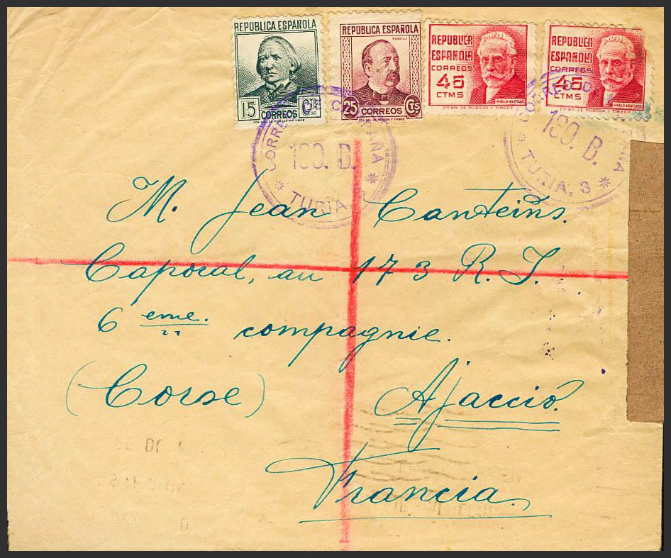 683, 685, 737(2). 1938. 15 cts verde, 25 cts carmín y 45 cts carmín rosa, dos sellos. Desde "El frente" a AJACCIO (CORCEGA). Matasello CORREO DE CAMPAÑA / 130. B. / *TURIA 3*, en violeta y al dorso tránsito. MAGNIFICA Y MUY RARO DESTINO DURANTE LA GUERRA CIVIL.