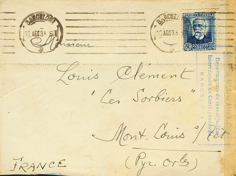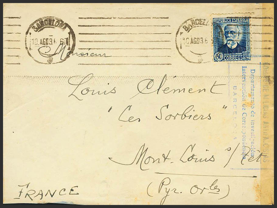 Guerra Civil. Bando Republicano. COMITE DE MILICIAS / INTERVENCION DE CORRESPONDENCIA, al dorso llegada. MAGNIFICA.
