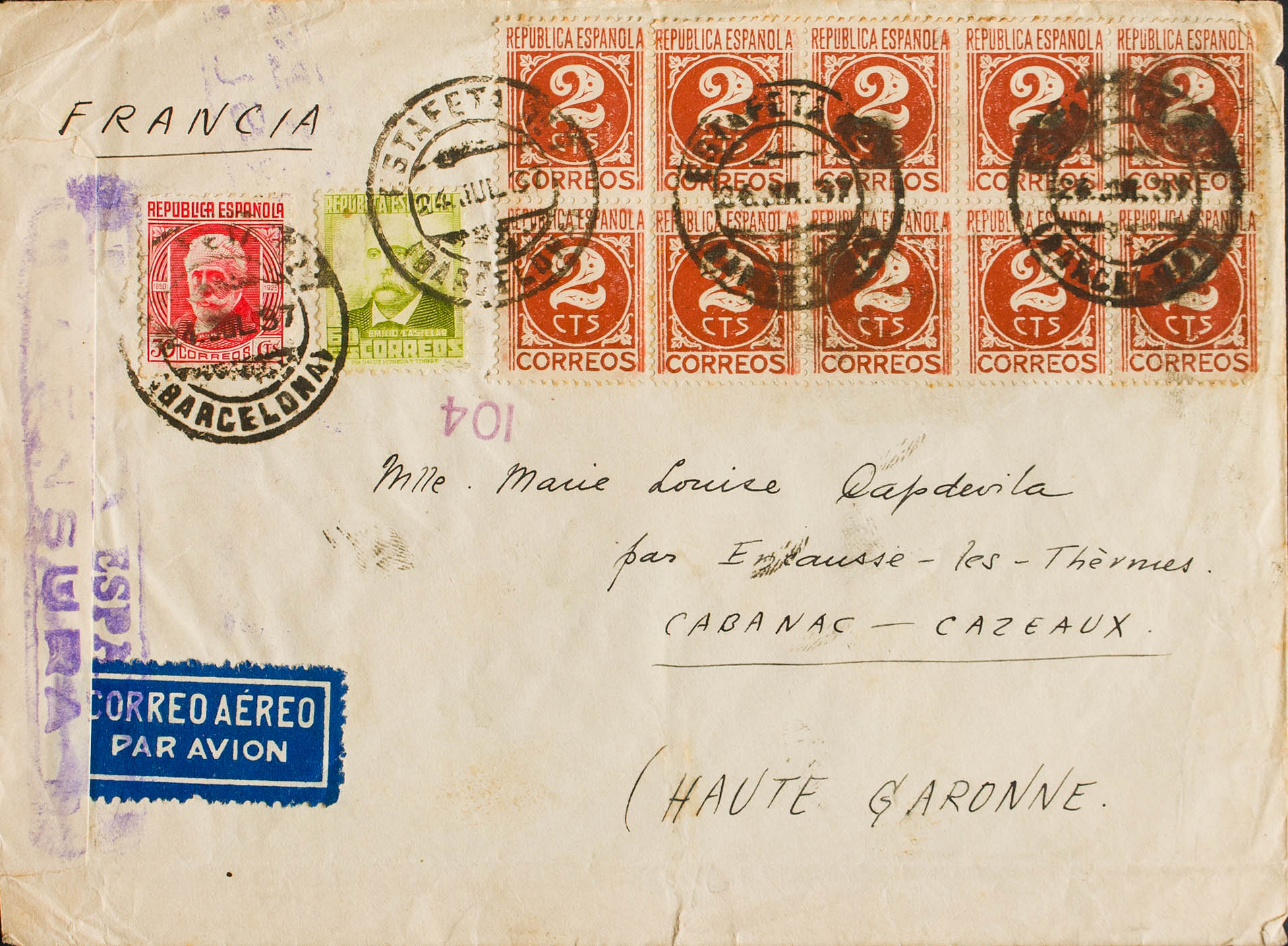 672, 731(10), 734. 1937. 60 cts oliva, 30 cts rojo y 2 cts castaño rojo, diez sellos. BARCELONA a CABANAC (FRANCIA). Al dorso llegada. MAGNIFICA.