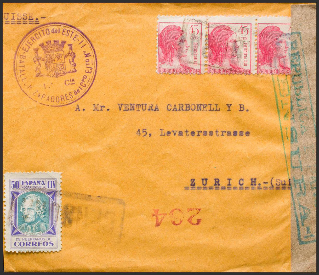752(3). (1938ca). 45 cts rosa, tres sellos y 50 cts violeta y azul verdoso de Beneficencia. Desde "El frente" a ZURICH (SUIZA). Matasello CENSURA y en el frente marca EJERCITO DEL ESTE / BATALLON ZAPADORES DEL I CPO EJTO Nº11, en violeta. MAGNIFICA.