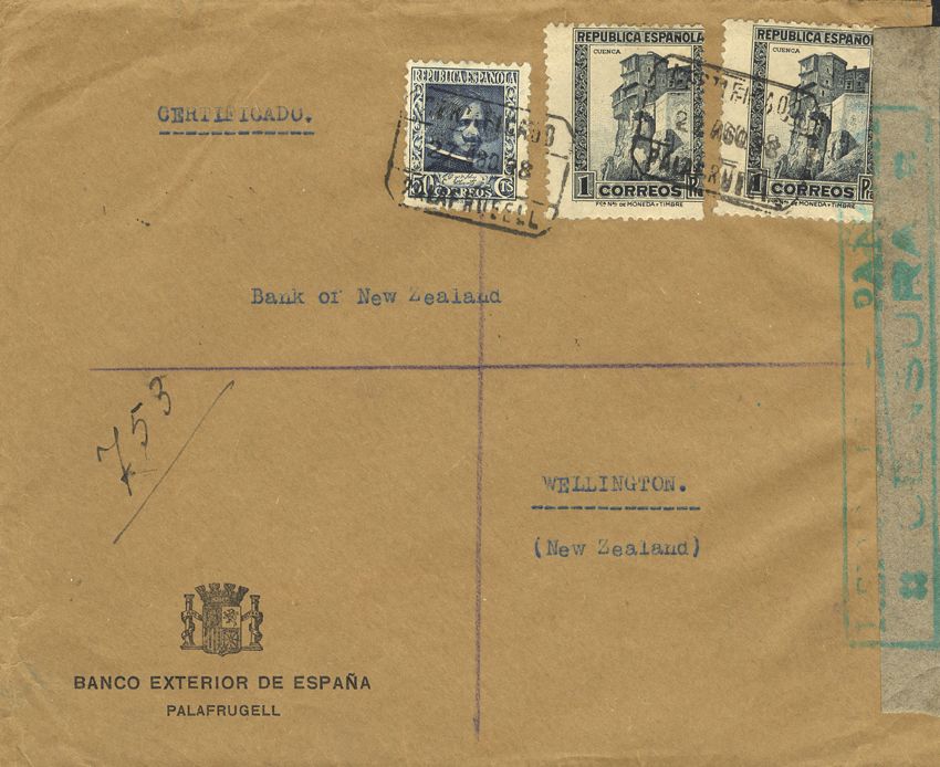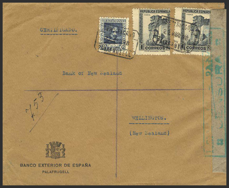 738, 770(2). 1938. 50 cts. y 1 pts., dos sellos. PALAFRUGELL a WELLINGTON (NUEVA ZELANDA). Matasello CERTIFICADO / PALAFRUGELL, en el frente marca REPUBLICA ESPAÑOLA / CENSURA. MAGNIFICA.