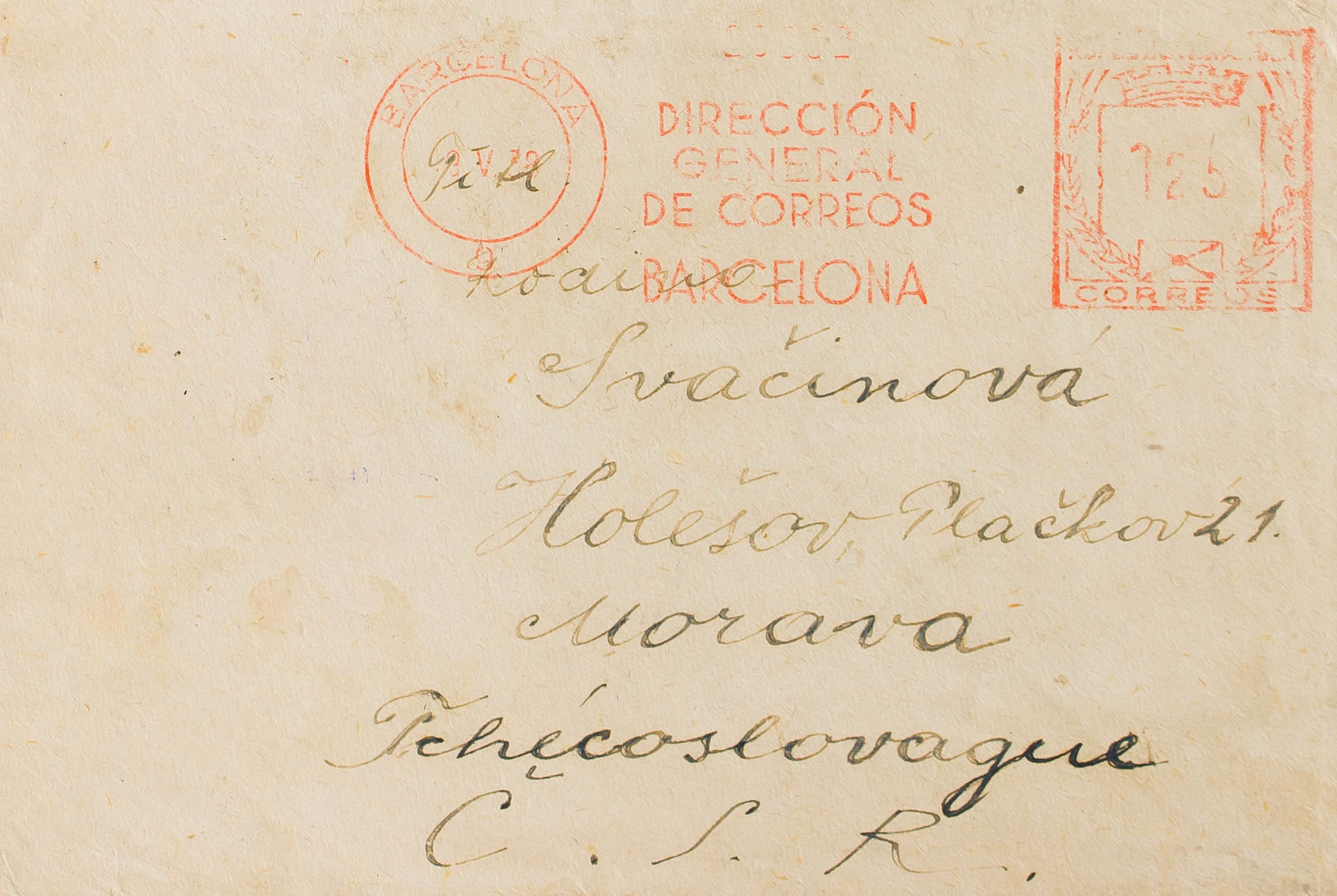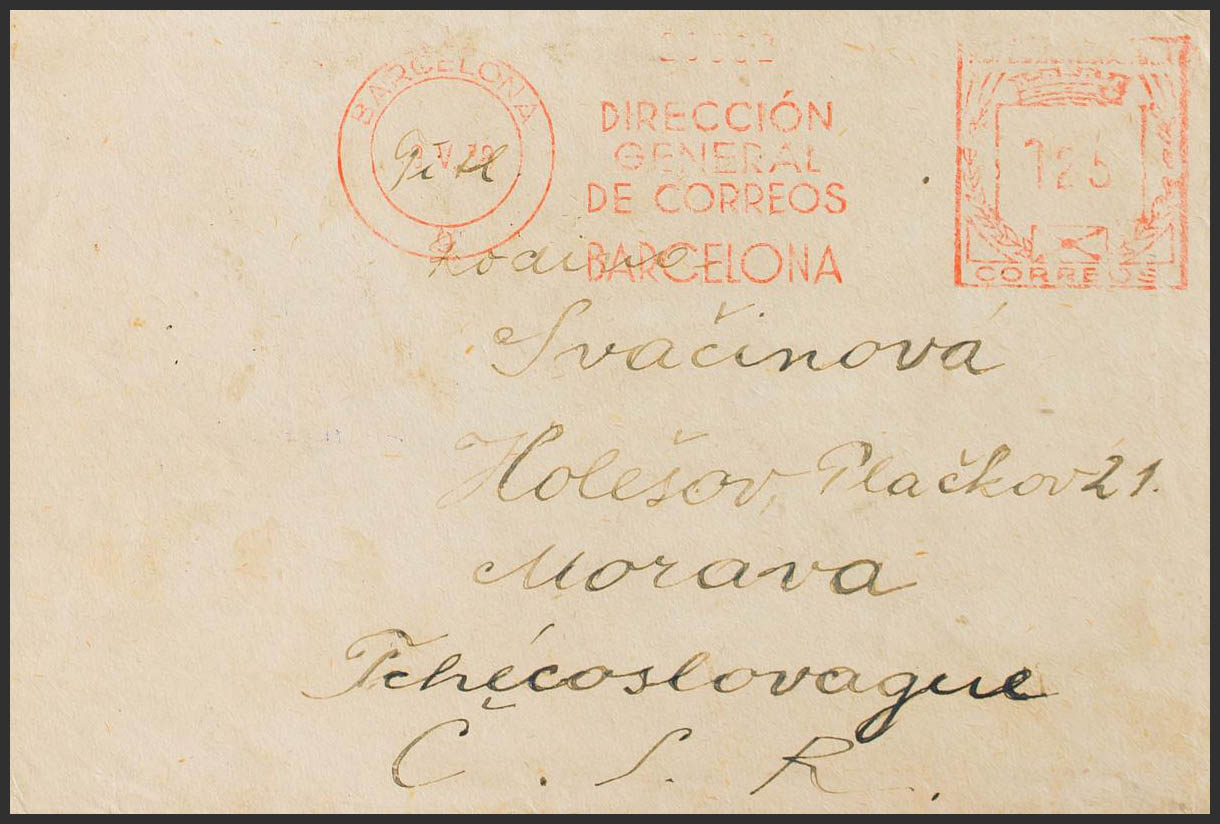 1938. 1´25 pts Franqueo Mecánico. BARCELONA a MORAVIA (CHECOSLOVAQUIA). El servicio Central de Correos de las Brigadas Internacionales se instala en Barcelona desde enero de 1938, unos meses antes de la ruptura de la zona Republicana por las tropas Nacionales. MAGNIFICA Y RARA.