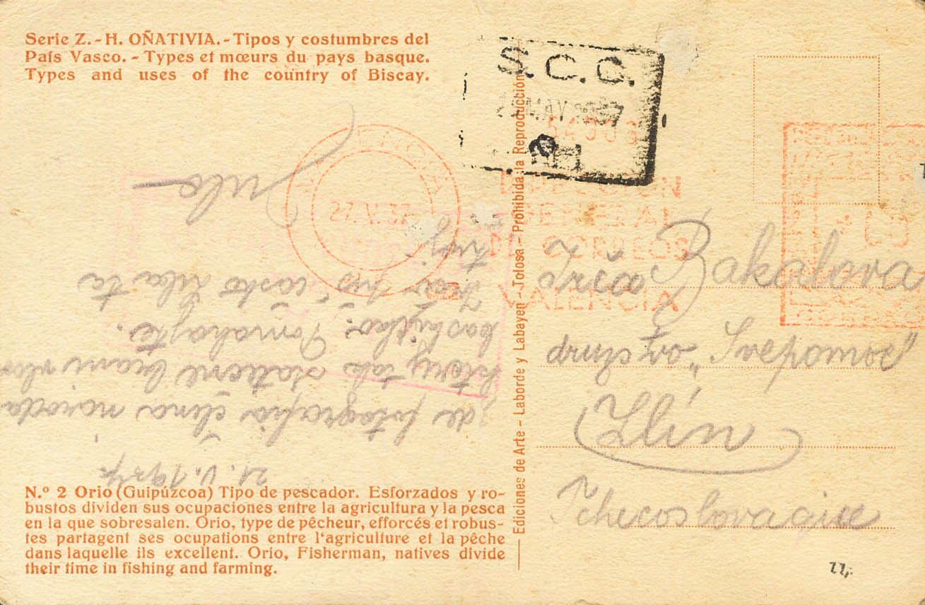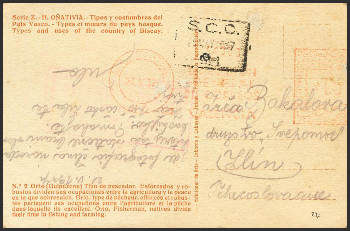 1937. Tarjeta Postal Ilustrada (Oñativia, serie Z) con franqueo mecánico de 60 cts circulada de VALENCIA a ZLIN (CHECOSLOVAQUIA). Fechador S.C.C. / 111. MAGNIFICA Y RARISIMA.