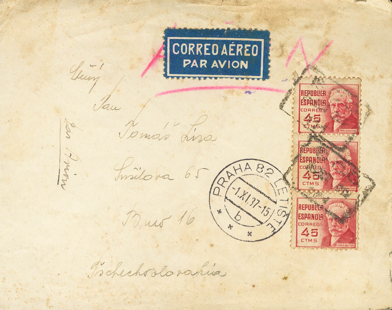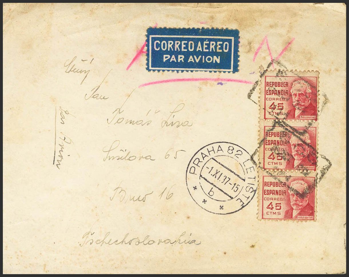 737(3). 1937. 45 cts rosa carmín, tres sellos. Brigadas Internacionales dirigida a BRNO (CHECOSLOVAQUIA) Matasello S.C.C. / 111 y tránsito en el frente. MAGNIFICA.