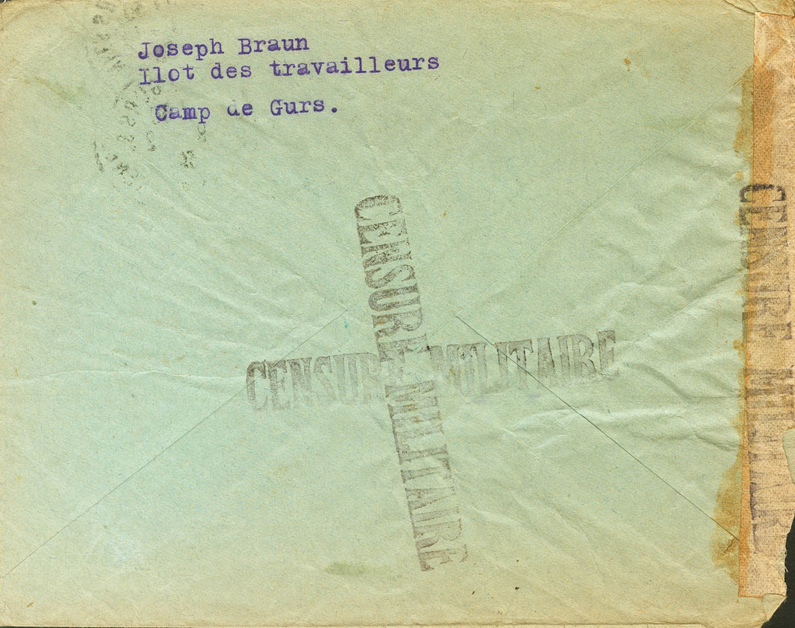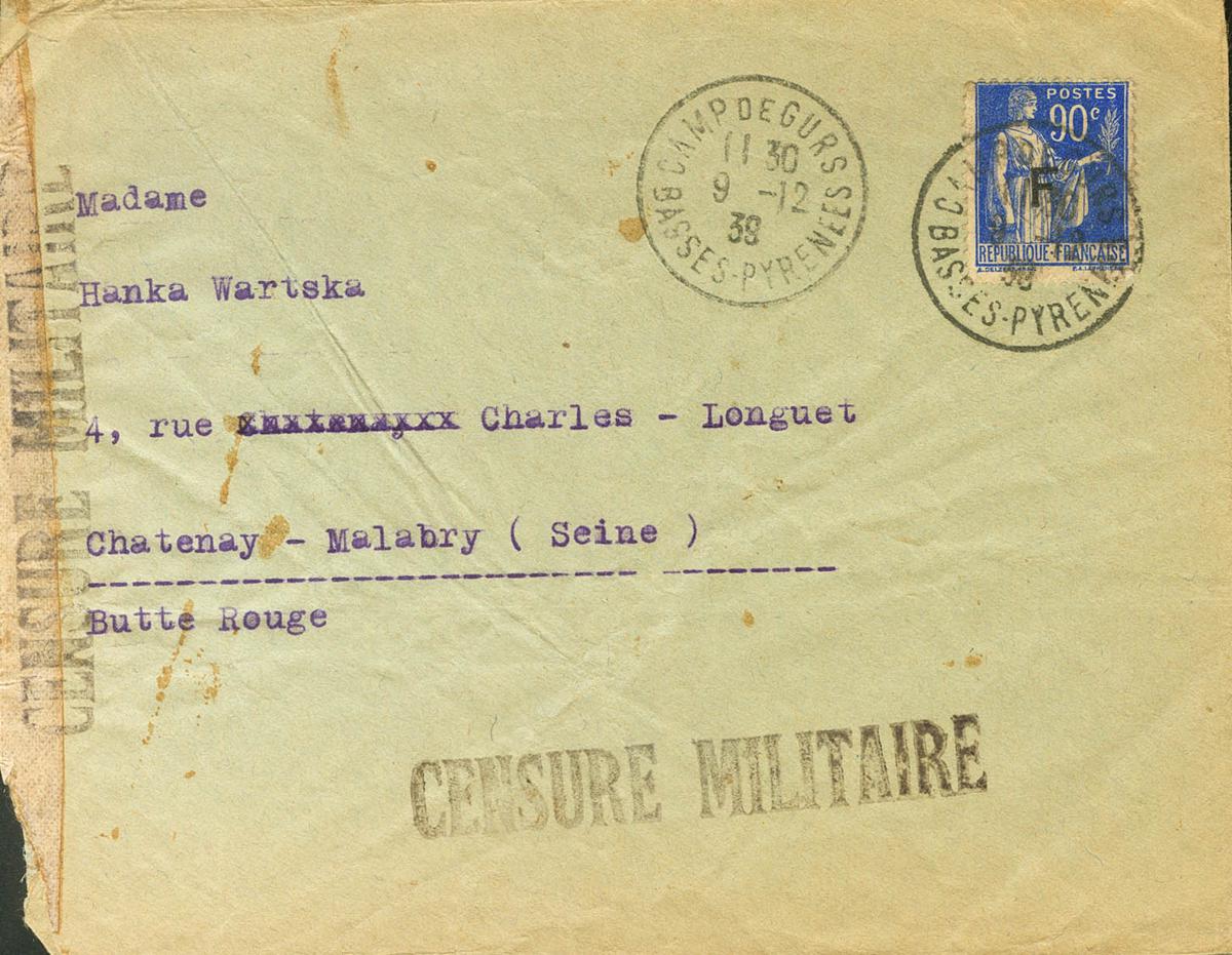 1939. 90 cts azul de Francia, sobrecarga F. GURS a CHATENAY-MALABRY (FRANCIA), remitida por un miembro de las Brigadas Internacionales internado en el Campo de Gurs, en el "l lot des travailleurs" (se trata de un combatiente de la brigada Dombrowski internado en este campo y con ascendencia chescoslovaca, el campo de Gurs fue uno de los centros de internamiento donde más brigadistas extranjeros fueron internados). MAGNIFICA Y MUY RARA.