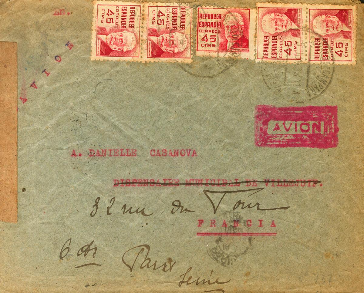 1938. 45 cts carmín, cinco sellos. Brigadas Internacionales dirigida a VILLEJUIF (FRANCIA), reexpedida a PARIS. Matasello CORREO DE CAMPAÑA / B.I. / E. DE C. Nº4, al dorso llegadas. MAGNIFICA.