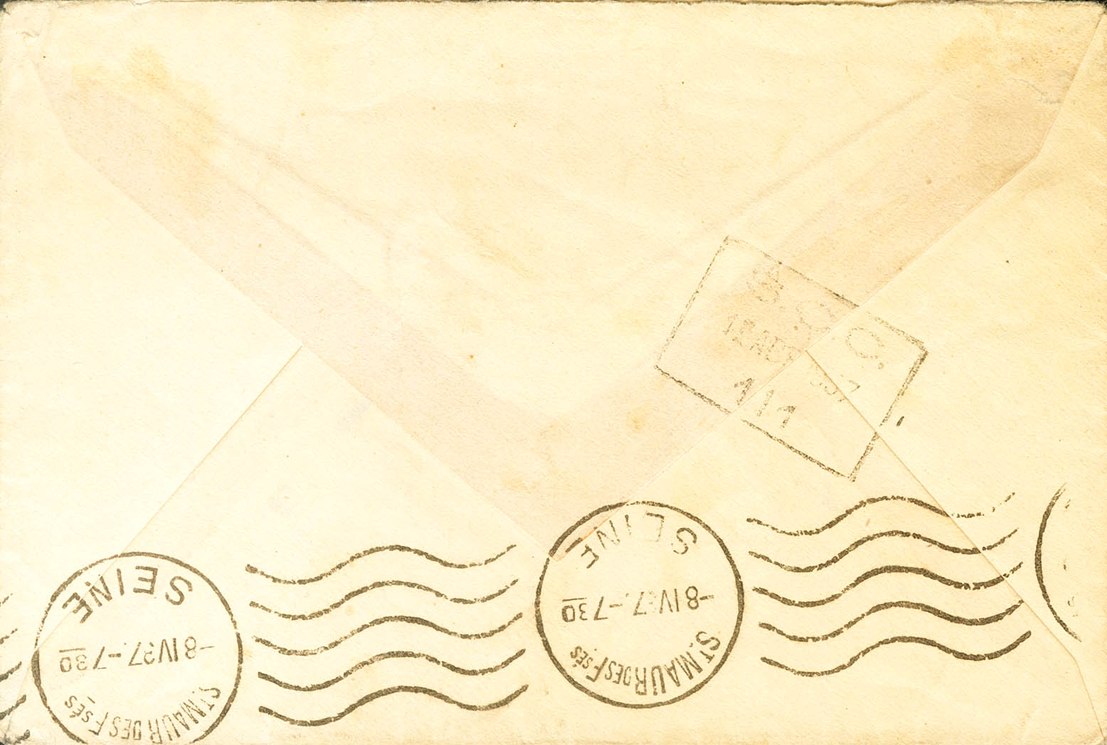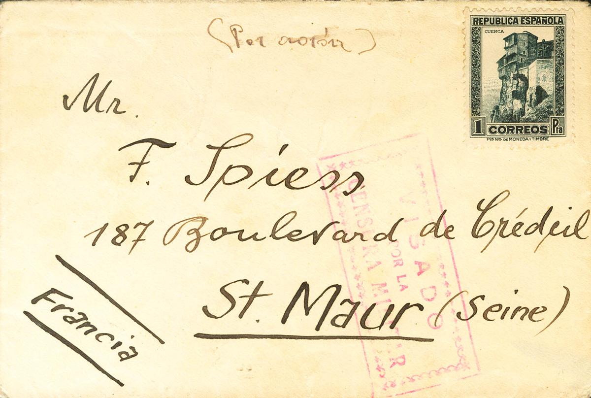 673. 1937. 1 pts pizarra (sin matasellar). Dirigida a SAINT MAUR DES FOSSES (FRANCIA). Al dorso fechador S.C.C. / 111, de Albacete y llegada. MAGNIFICA Y RARA.
