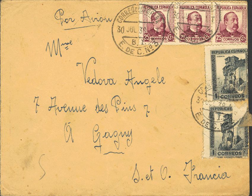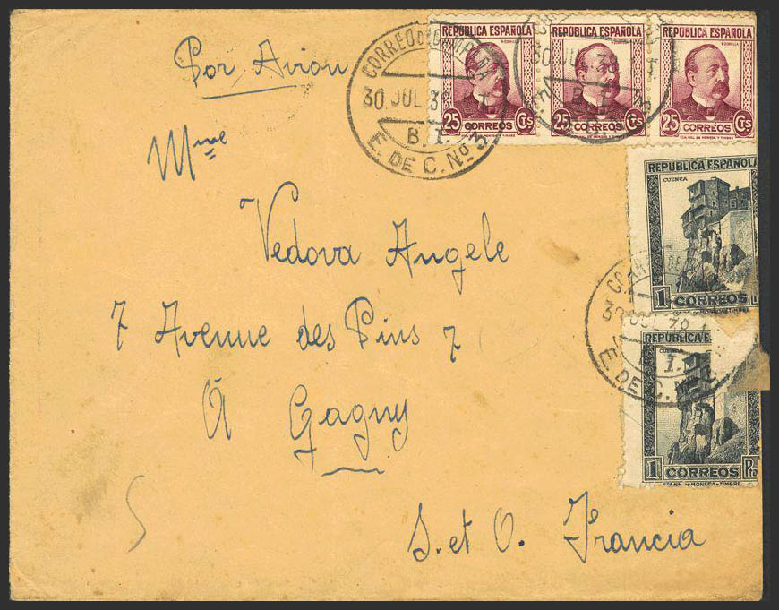 Guerra Civil. Brigada Internacional. CORREO DE CAMPAÑA / B. I. / E. DE C. Nº3, al dorso llegada. MAGNIFICA.