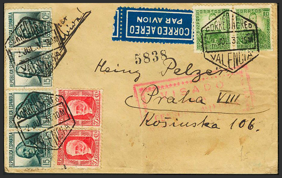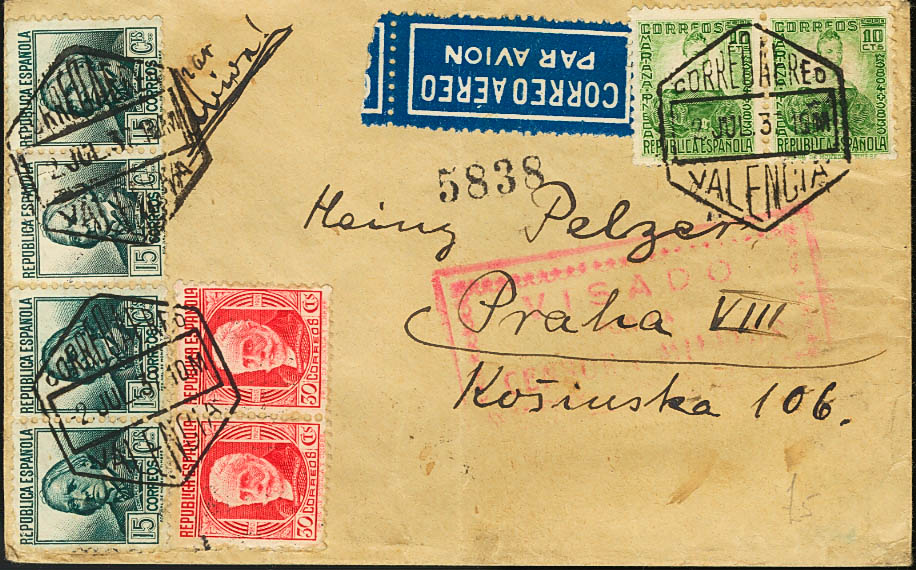 682(2), 683(4), 735. 1937. 10 cts verde, dos sellos, 15 cts verde gris, cuatro sellos y 30 cts rojo, dos sellos. Brigadas Internacionales de VALENCIA a PRAGA (CHECOSLOVAQUIA). Al dorso llegada. MAGNIFICA Y RARA.
