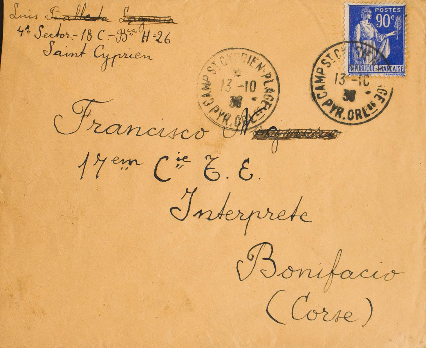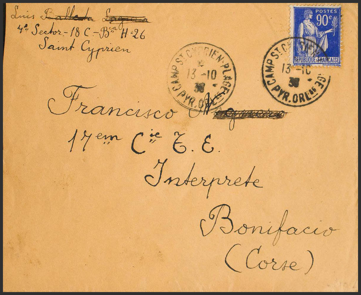 1939. 90 cts azul de Francia. SAINT CYPRIEN a BONIFACIO (CORCEGA), dirigida al 17 C.T.E. (Compagnie de Travailleurs Espagnols), de Bonifacio, del que no tenemos datos. Matasello CAMP ST. CYPRIEN PLAGE / PYR ORLES. MAGNIFICA Y RARA.