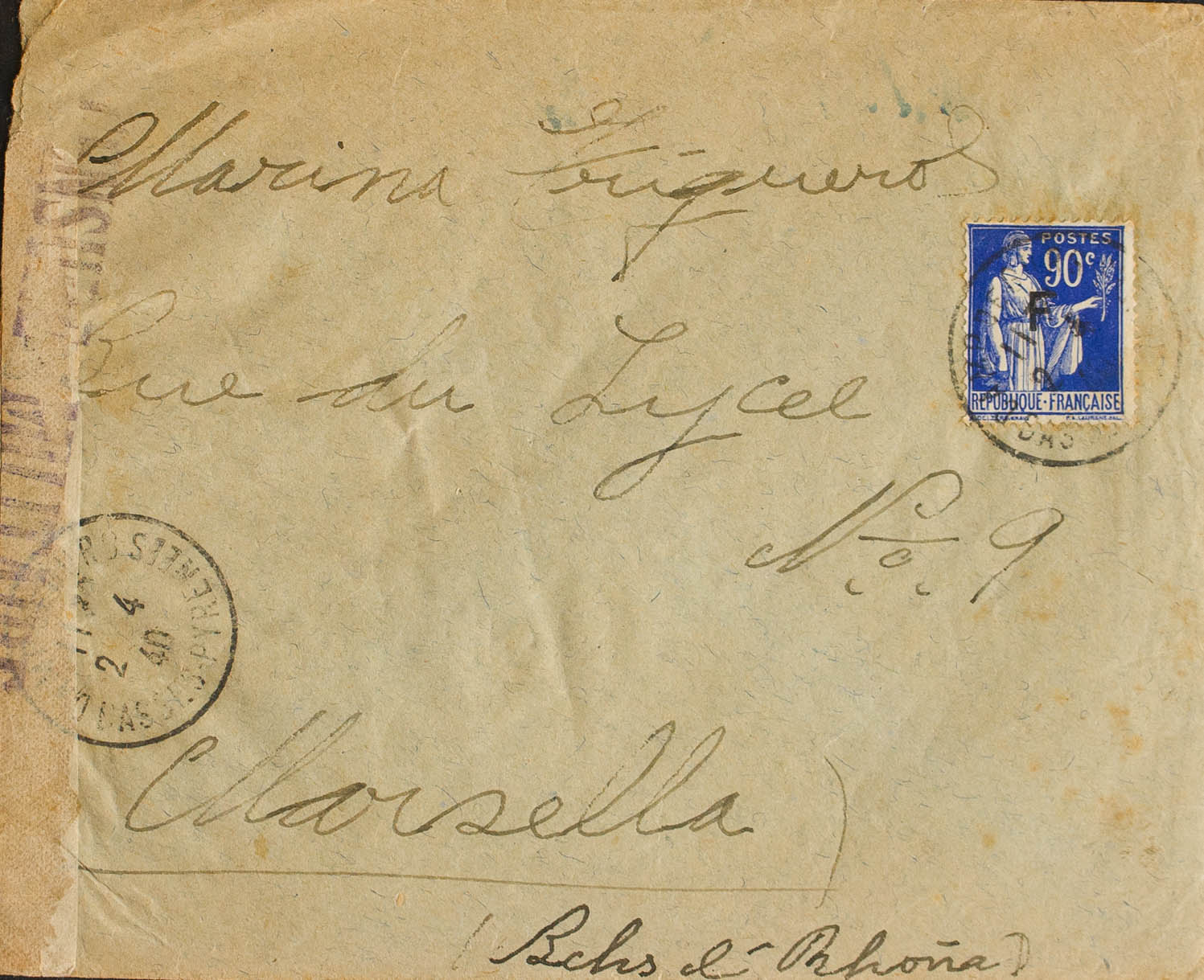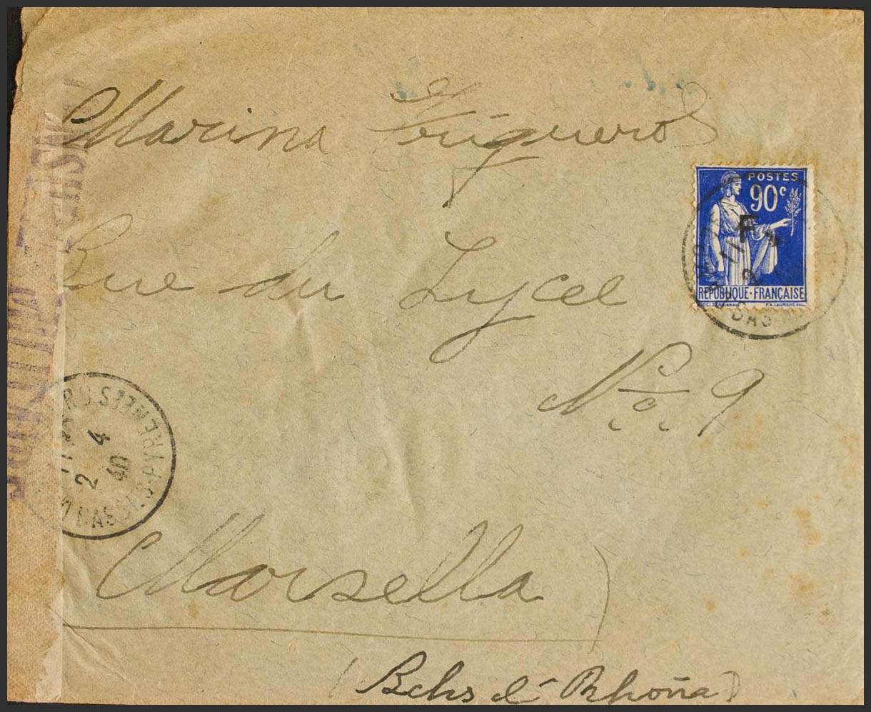 1940. 90 cts azul de Francia con sobrecarga "F". GURS a MARSELLA (FRANCIA), remitida por un internado del grupo cubano de la Compañía 257. Matasello CAMP DE GURS / BASSES PYRENEES. MAGNIFICA Y RARA.