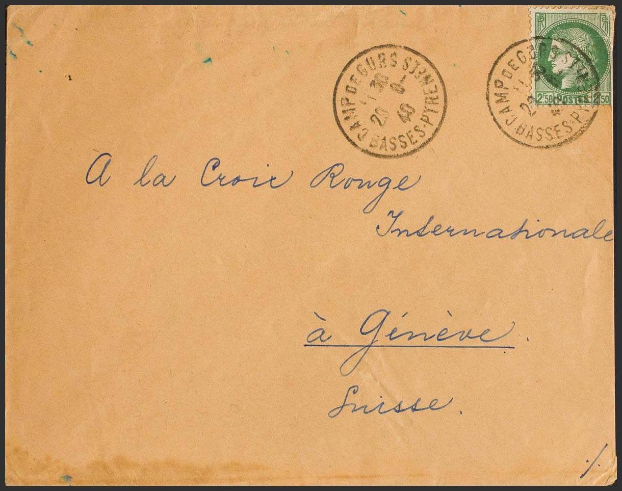 1940. 2´50 fr verde de Francia. GURS a GINEBRA (SUIZA). Matasello CAMP DE GURS / BASSES PYRENEES. MAGNIFICA Y RARA.