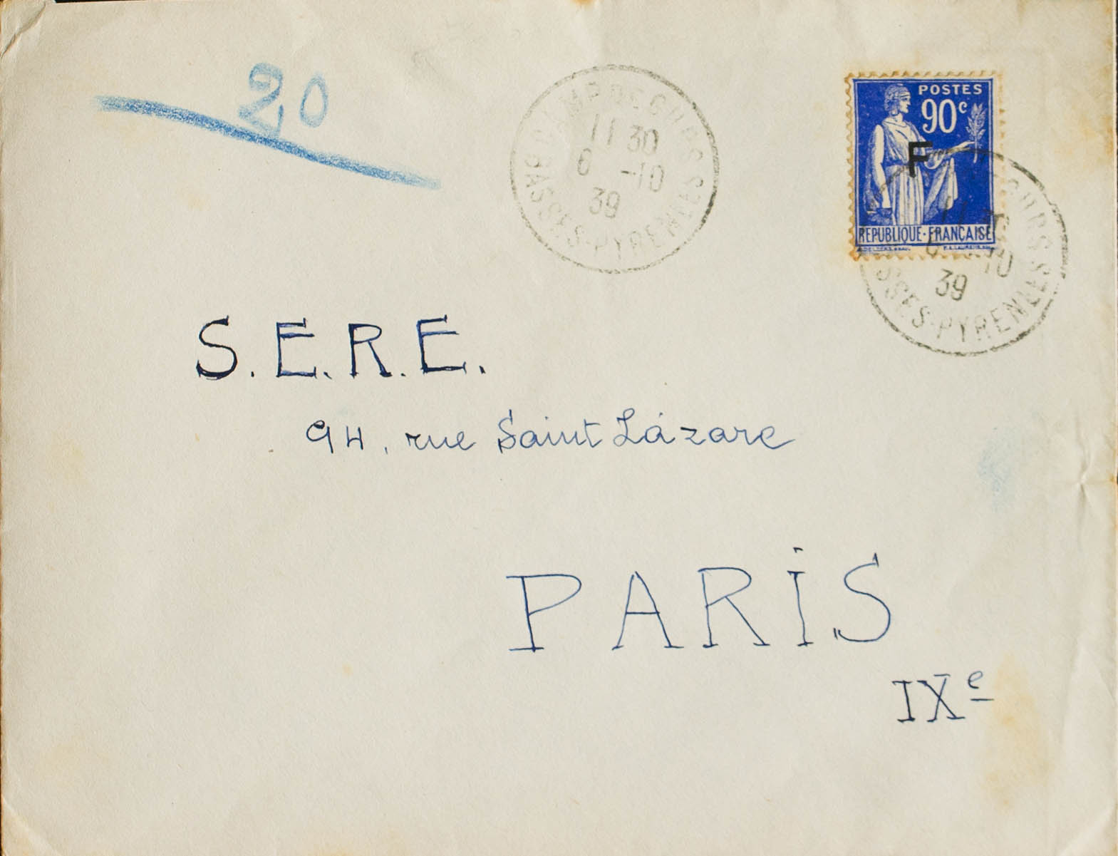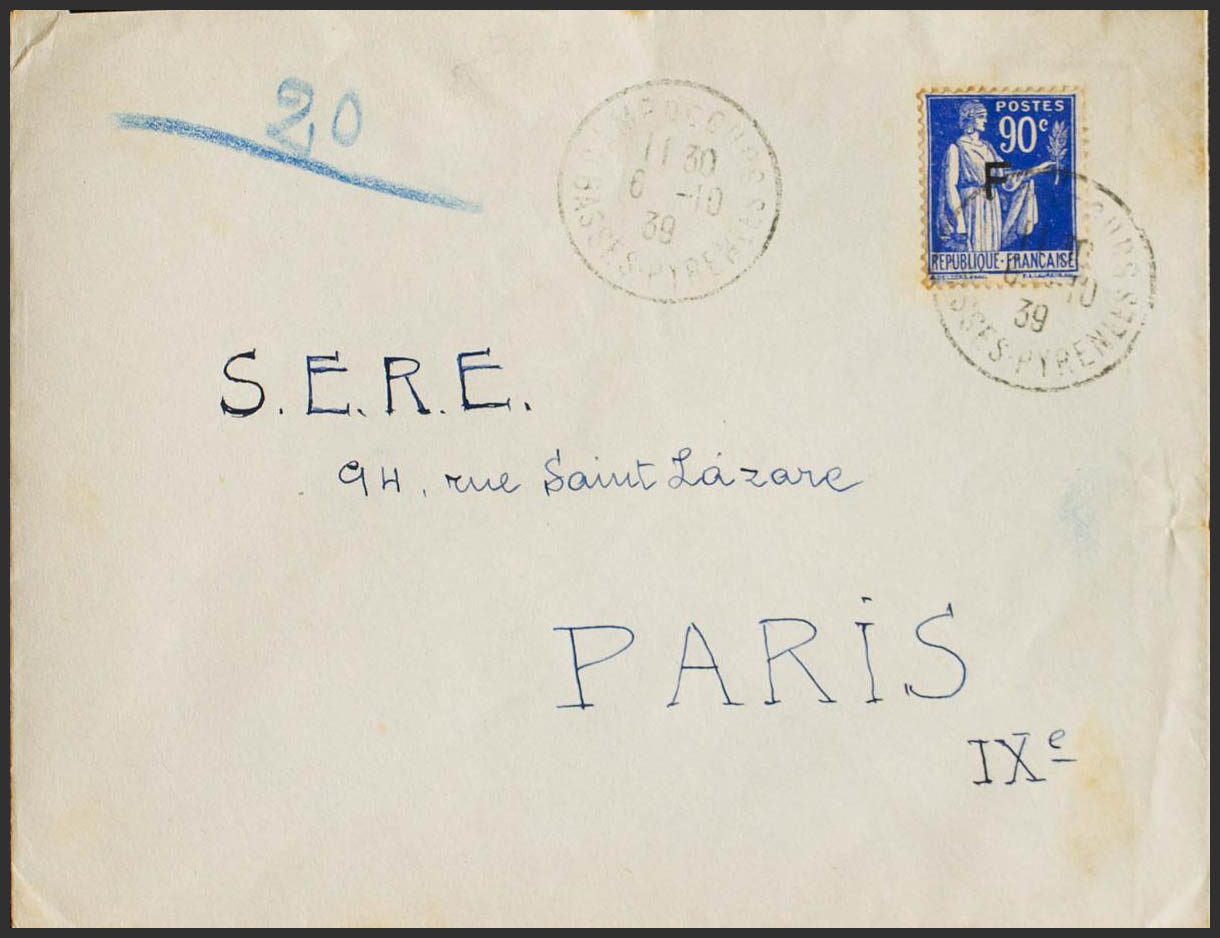 1939. 90 cts azul de Francia, con sobrecarga F. GURS a PARIS (ligeramente tonalizado y falta solapa trasera). Matasello CAMP DE GURS / BASSES PYRENEES. MAGNIFICA.