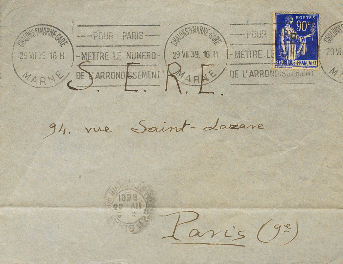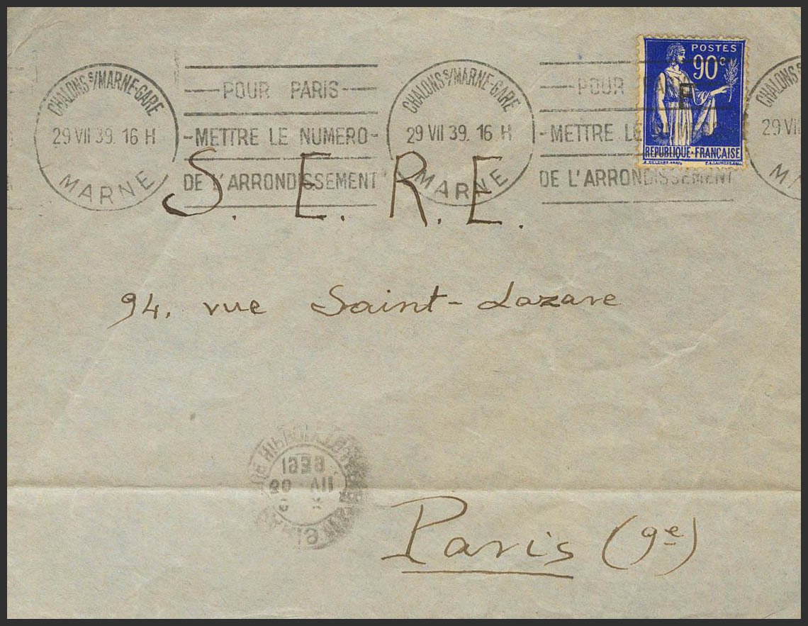 1939. 90 cts azul de Francia con sobrecarga "F". SUIPPES a PARIS, remitida por un español de G.T.E. (Grupos de trabajadores Españoles) de la 31 compagnie del Camp de Ripont. MAGNIFICA Y RARISIMA.