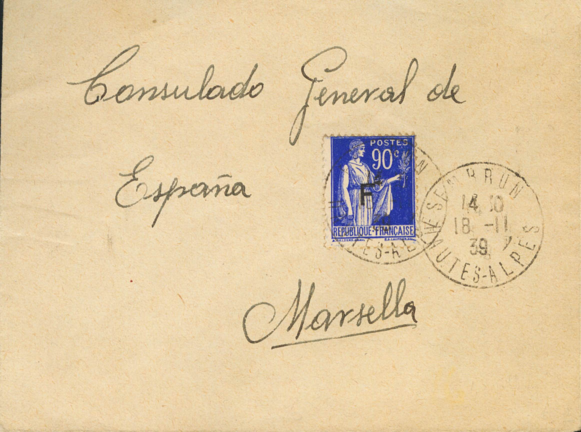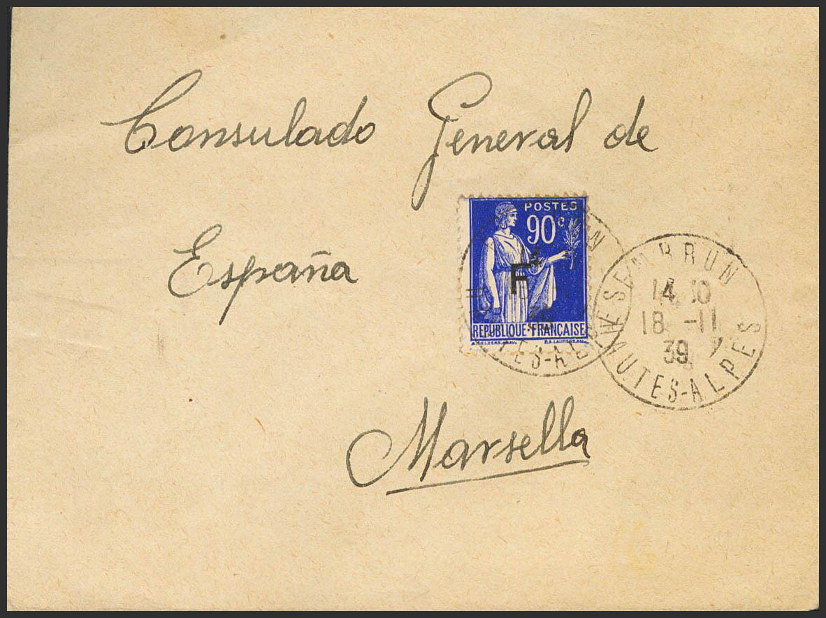 1939. 90 cts azul de Francia con sobrecarga "F". LE PONT NEUF (EMBRUN) a MARSELLA, remitida por un español integrado en la 87ª Compagnie des Travailleurs (C.T.E.). MAGNIFICA Y RARA.