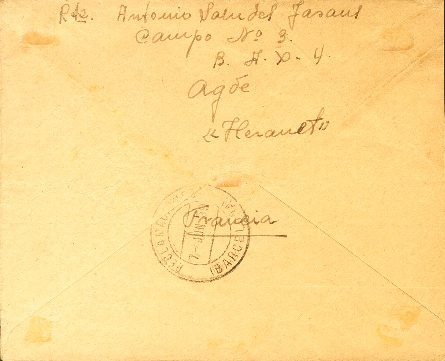 1939. AGDE a BARCELONA, remitida desde el Campo de Refugiados de Agde por un español allí internado. Fechador CAMP D´AGDE / HERAULT, marca de tasa PTAS 1´40 y CENSURA MILITAR / VALENCIA, muy probablemente la correspondencia entró vía Valencia, ambas en violeta y al dorso llegada. MAGNIFICA Y MUY RARA.