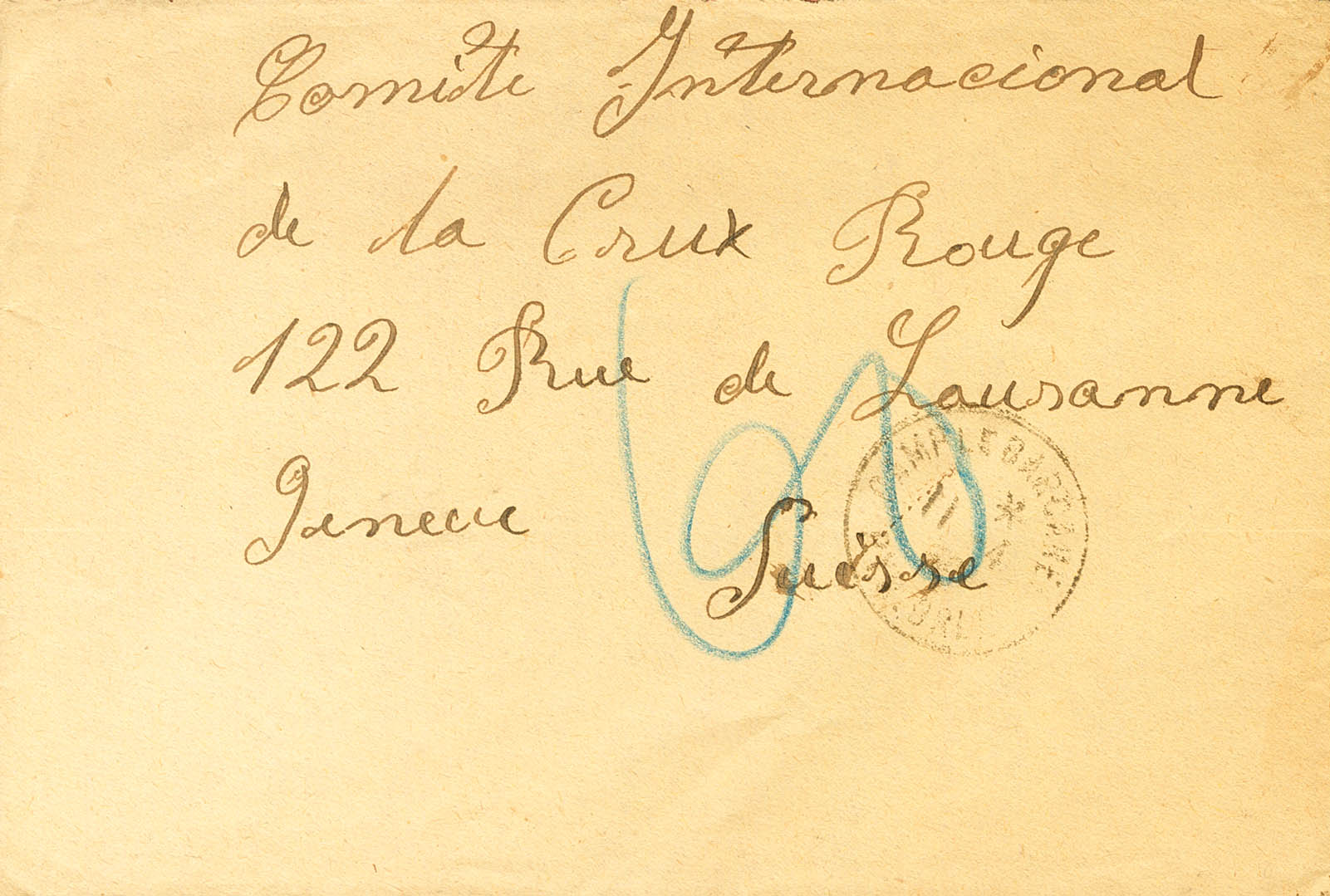 1939. LE BARCARES (FRANCIA) a GINEBRA (SUIZA), remitida por un español internado en el Campo de Internamiento de Le Barcares. Tasada por falta de franqueo. MAGNIFICA Y RARA.