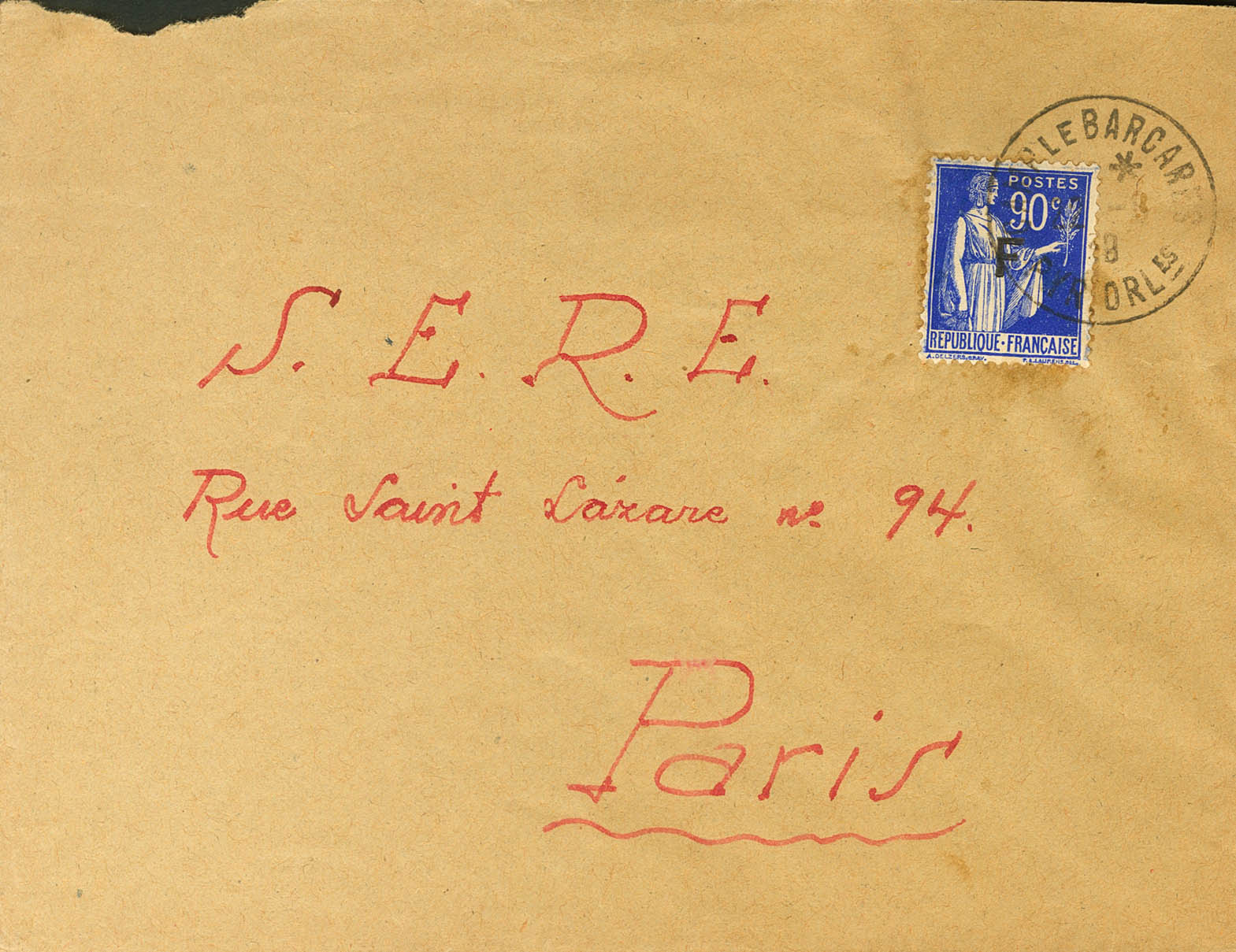 1939. 90 cts de Francia, sobrecarga F. LE BARCARES a PARIS. Matasello CAMP LE BARCARES / PYR.ORLES. MAGNIFICA Y RARA.