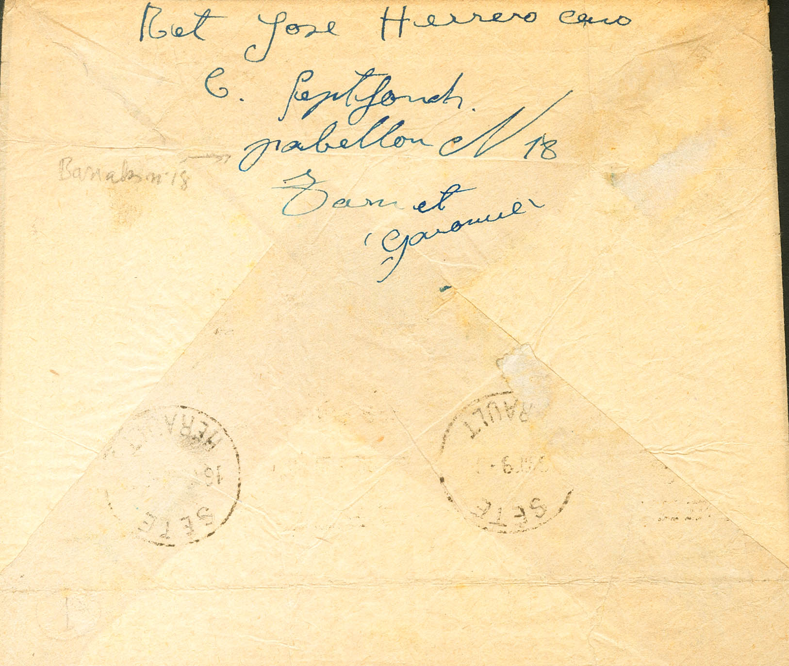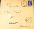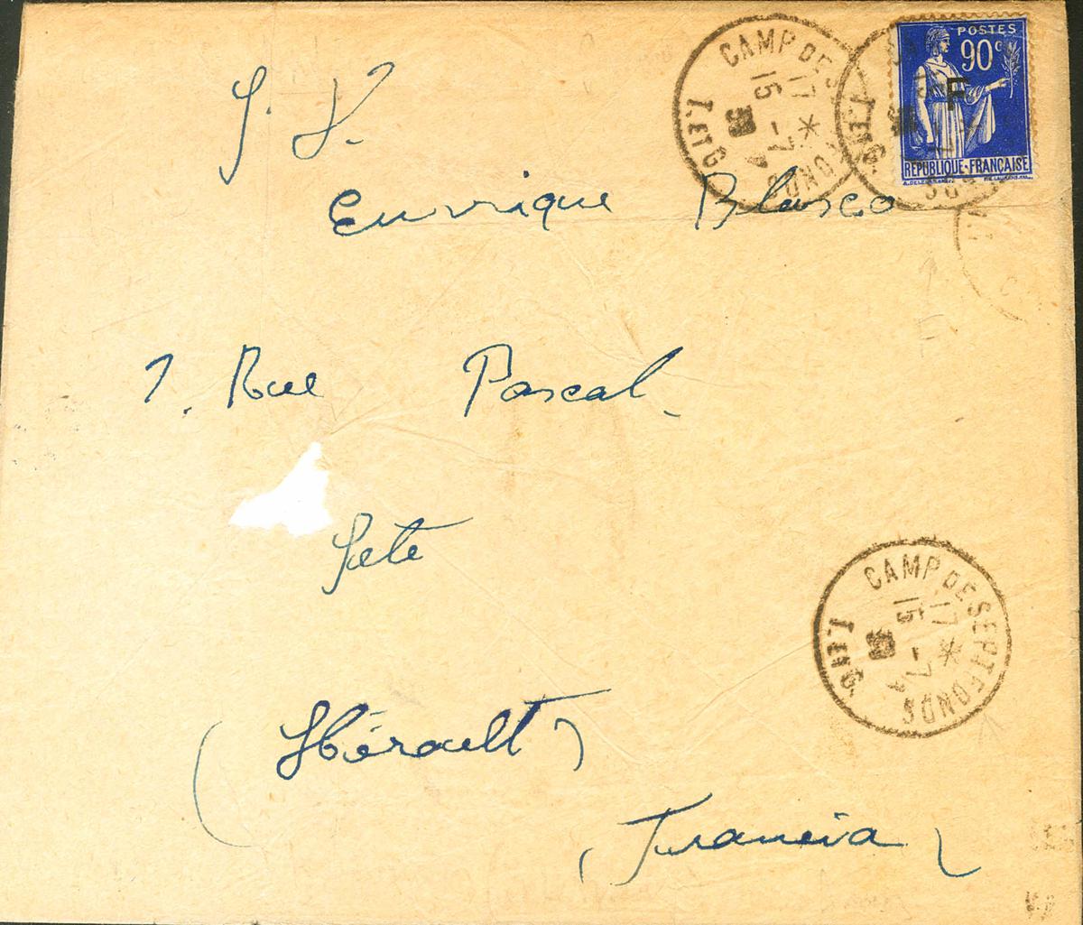 1939. 90 cts azul de Francia, sobrecarga F. SEPTFONDS a SETE (erosión en el frente). Este campo, también conocido como de Judes, se levantó para aliviar la presión de otros campos y de él salieron numerosos internos a los G.T.E. "Groupes des Travailleurs Etrangers". BONITA Y RARA.