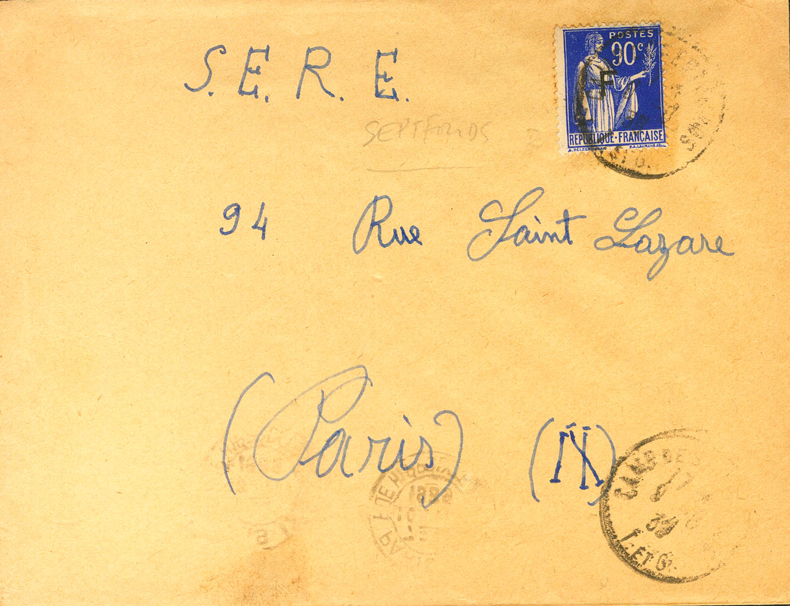 1939. 90 cts azul de Francia, sobrecarga F. SEPTFONDS a PARIS (falta solapa del remite). Matasello CAMP DE SEPTFONDS / T.E.T.G. MAGNIFICA Y RARA.