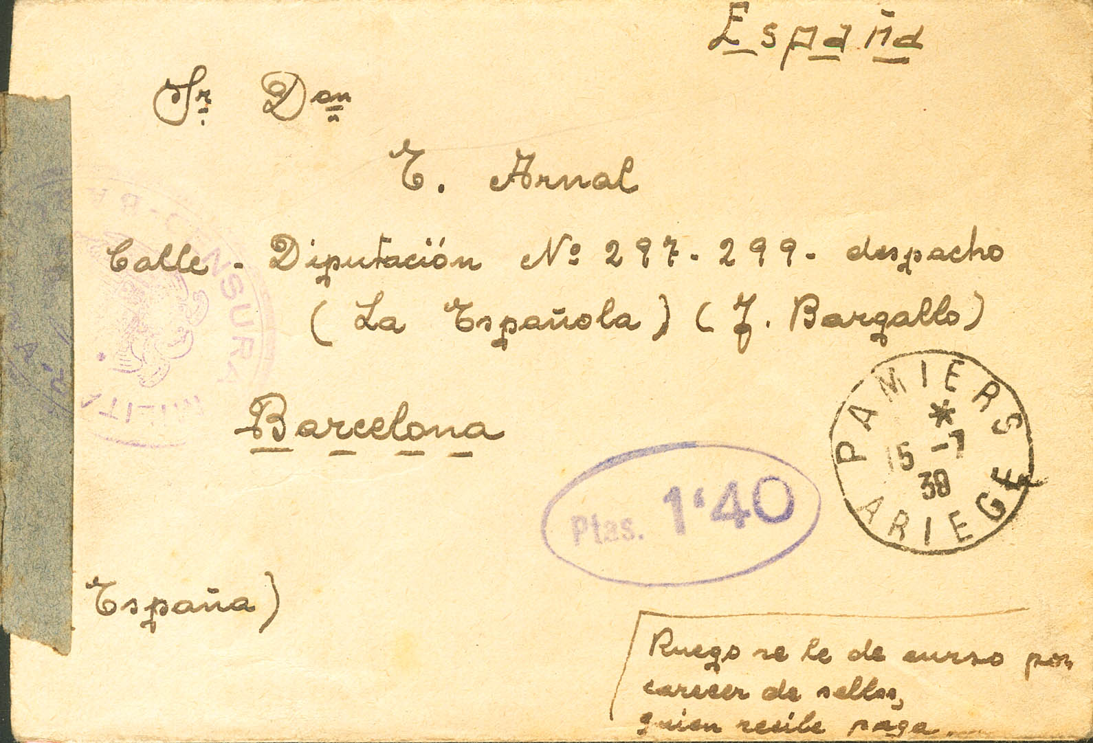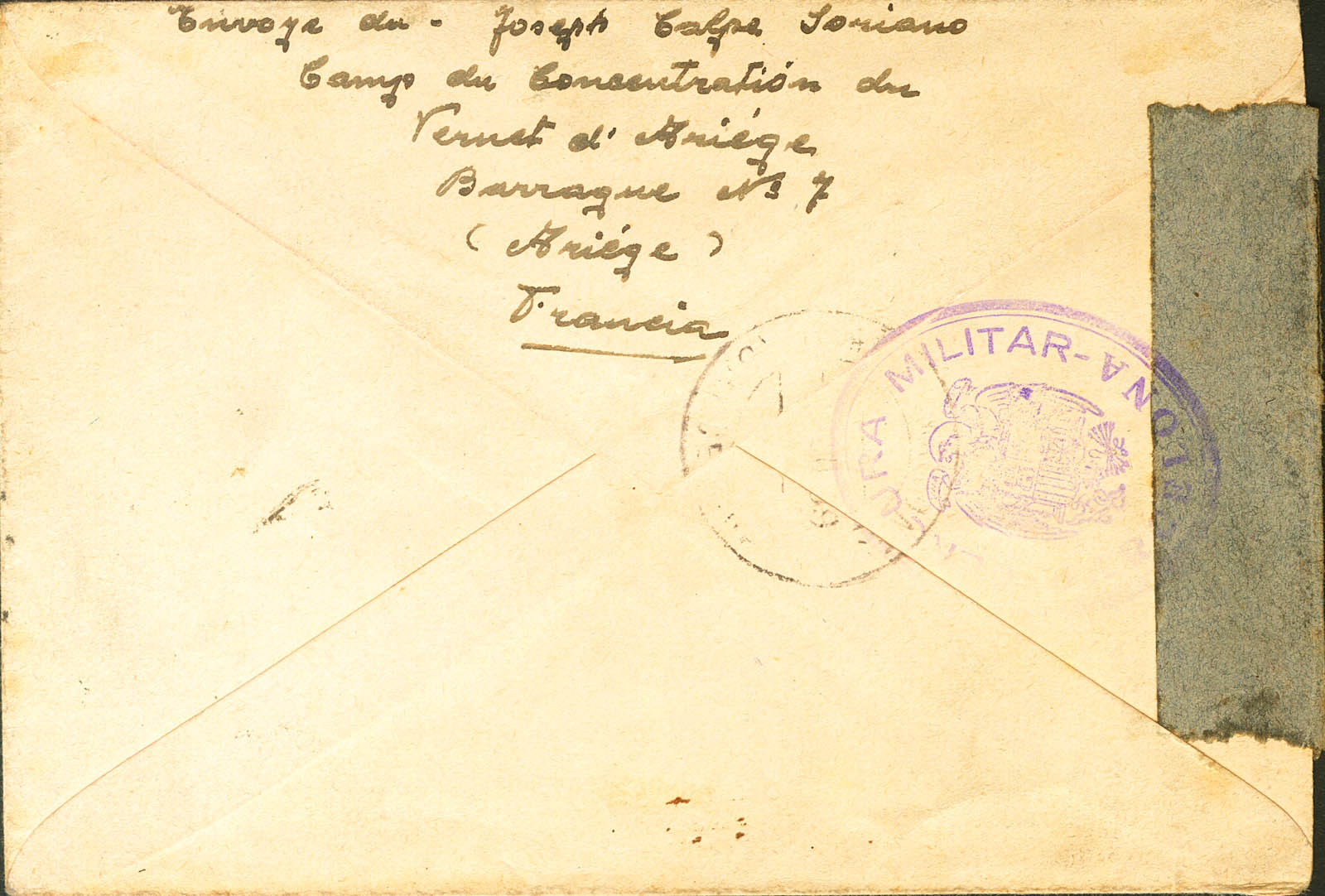 1939. PAMIERS (FRANCIA) a BARCELONA, remitida por un español internado en el Campo de Internamiento de Vernet d´Ariege, este campo se destinó en un principio para confinar a cerca de diez mil combatientes de la División Durruti, poco después se utilizó para internar a refugiados y combatientes de las Brigadas Internacionales. Fechador PAMIERS / ARIEGE y marca de tasa PTAS 1´40, en violeta. MAGNIFICA Y MUY RARA.