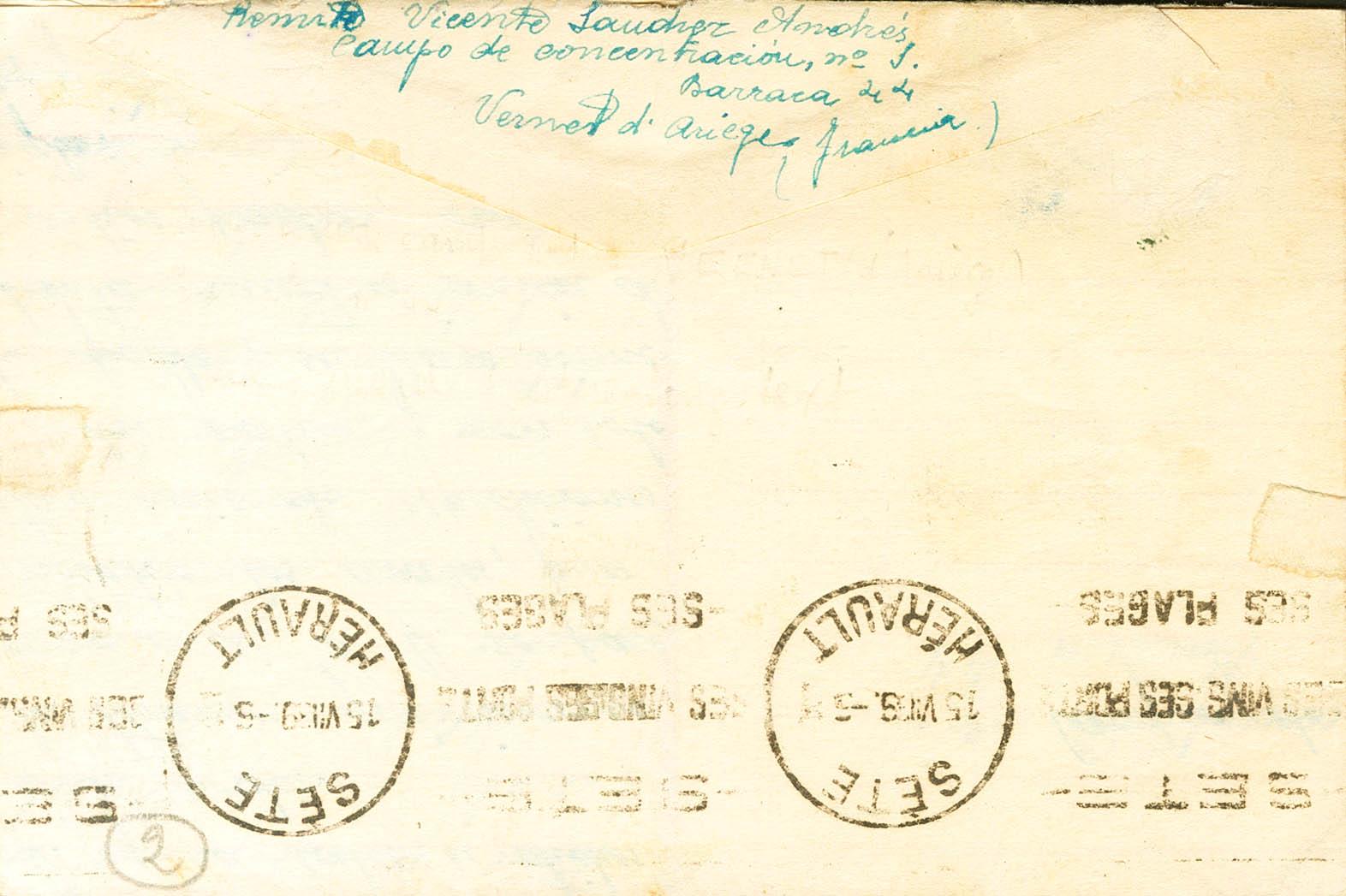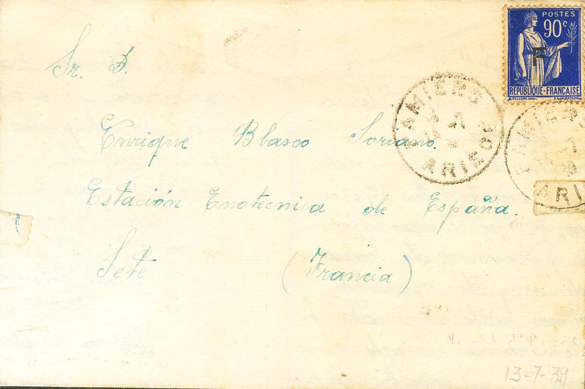 1939. 90 cts azul de Francia, sobrecarga F. PAMIERS a SETE, remitida por un militar español (Teniente Vicente Sánchez, procedente de la 117 Brigada Mixta) internado en el Campo de Internamiento de Vernet d´Ariege. MAGNIFICA Y RARA.