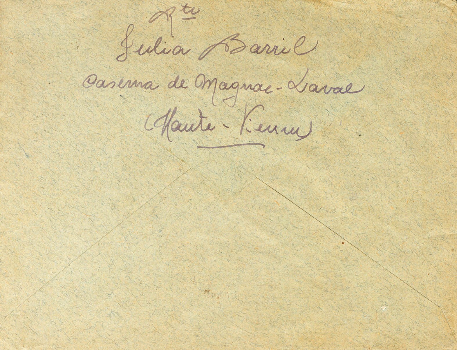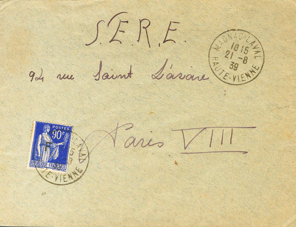 1939. 90 cts azul de Francia, sobrecarga F. MAGNAC LA LAVAL a PARIS, remitida por una refugiada española internada en el Campo de Magnac en Laval, ubicado en un antiguo cuartel abandonado en la población donde se llegaron a recoger a cerca de dos mil setecientos refugiados españoles, algunos redistribuídos por otras ciudades y pueblos del departamento de Haute Vienne. MAGNIFICA Y MUY RARA.