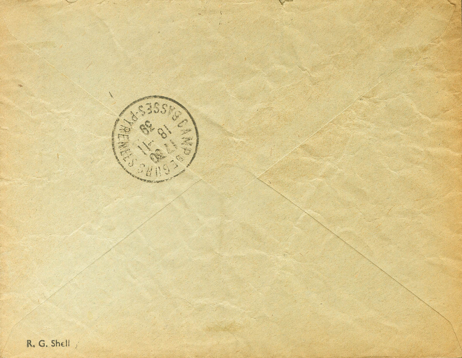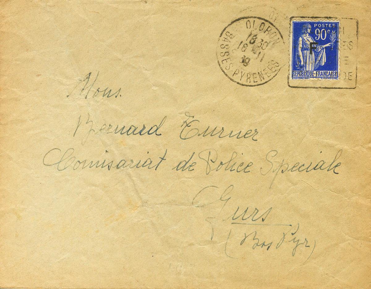 1939. 90 cts azul de Francia, sobrecarga F. OLORON a GURS, remitida muy probablemente por un refugiado español en Oloron y dirigida al Comisariado de Policía Especial del Campo de Gurs. MAGNIFICA Y RARA.