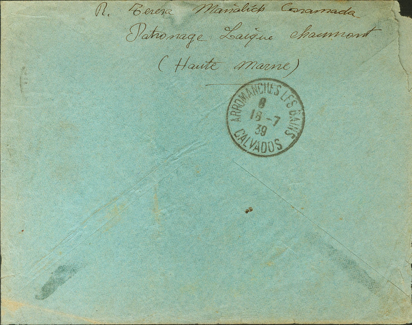 1939. 90 cts azul de Francia, sobrecarga F. CHAUMONT a ARROMANCHES, remitida por una refugiada española internada en un Alojamiento Temporal en Chaumont y dirigida a "Camp Bacances" en Arromanches. MAGNIFICA.