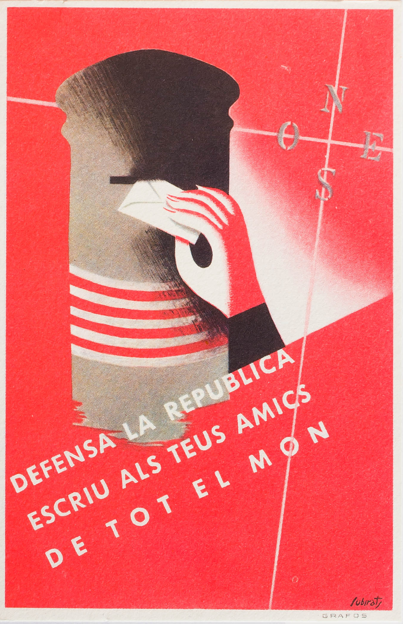 (1937ca). Tarjeta Postal Ilustrada del COMISSARIAT DE PROPAGANDA DE LA GENERALITAT DE CATALUNYA. DEFENSA LA REPUBLICA ESCRIU ALS TEUS AMICS DE TOT EL MON. MAGNIFICA Y MUY RARA.