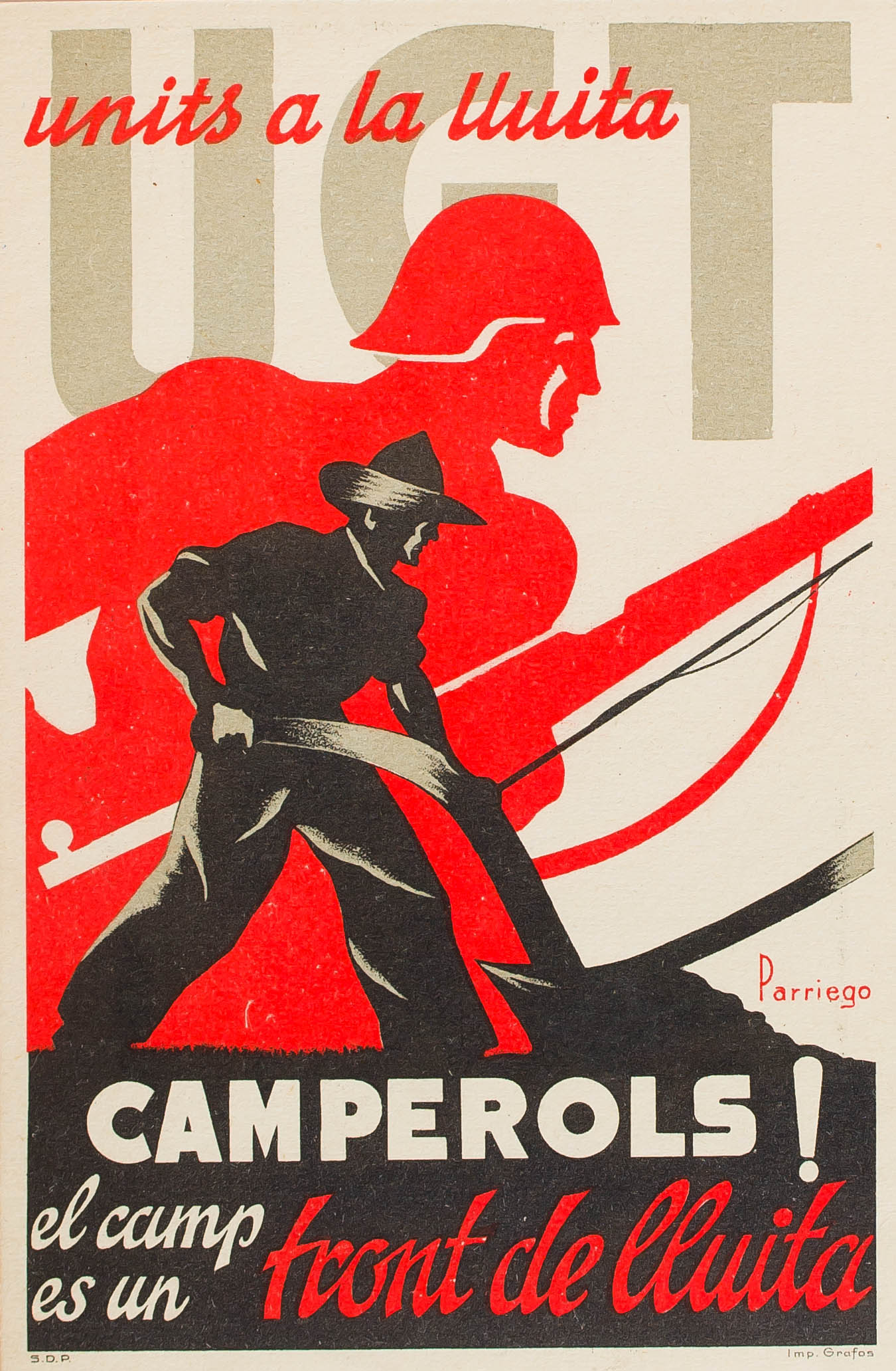 (1937ca). Tarjeta Postal Ilustrada del P.S.U.- U.G.T. CAMPEROL! EL CAMP ES UN FRONT DE LLUITA. MAGNIFICA.