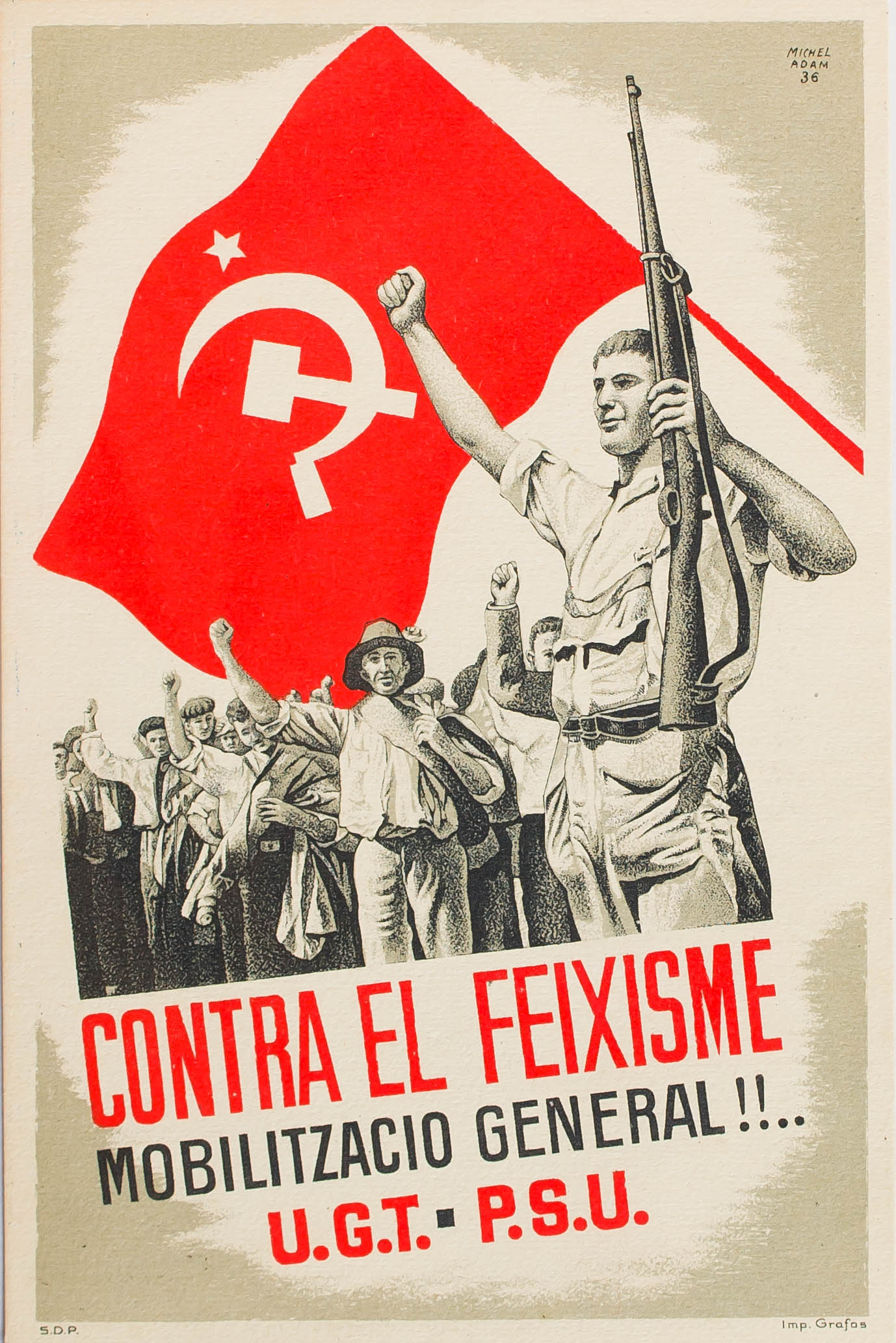(1937ca). Tarjeta Postal Ilustrada del P.S.U.- U.G.T. CONTRA EL FEIXISME MOBILITZACIO GENERAL!!. MAGNIFICA Y RARA.