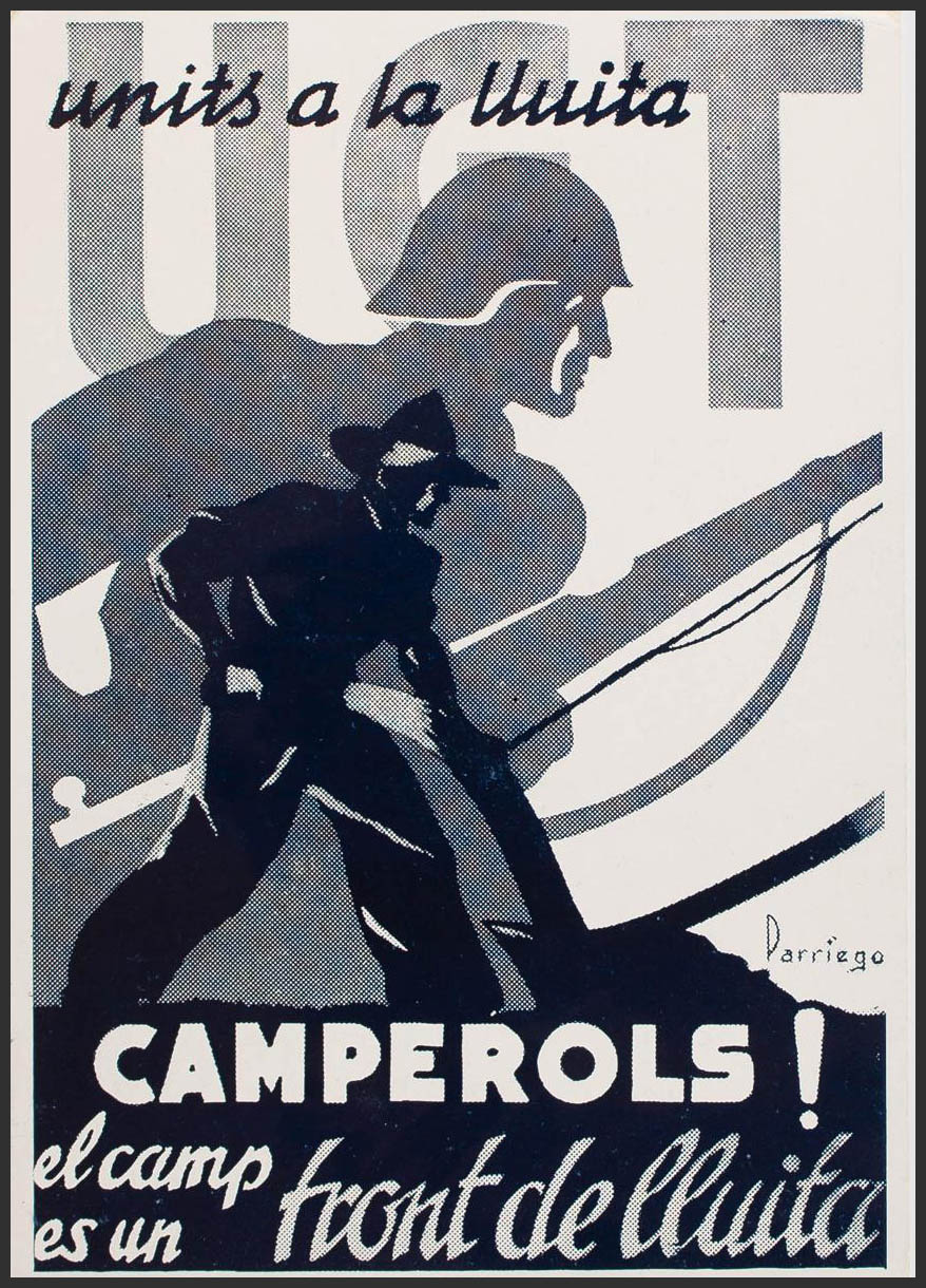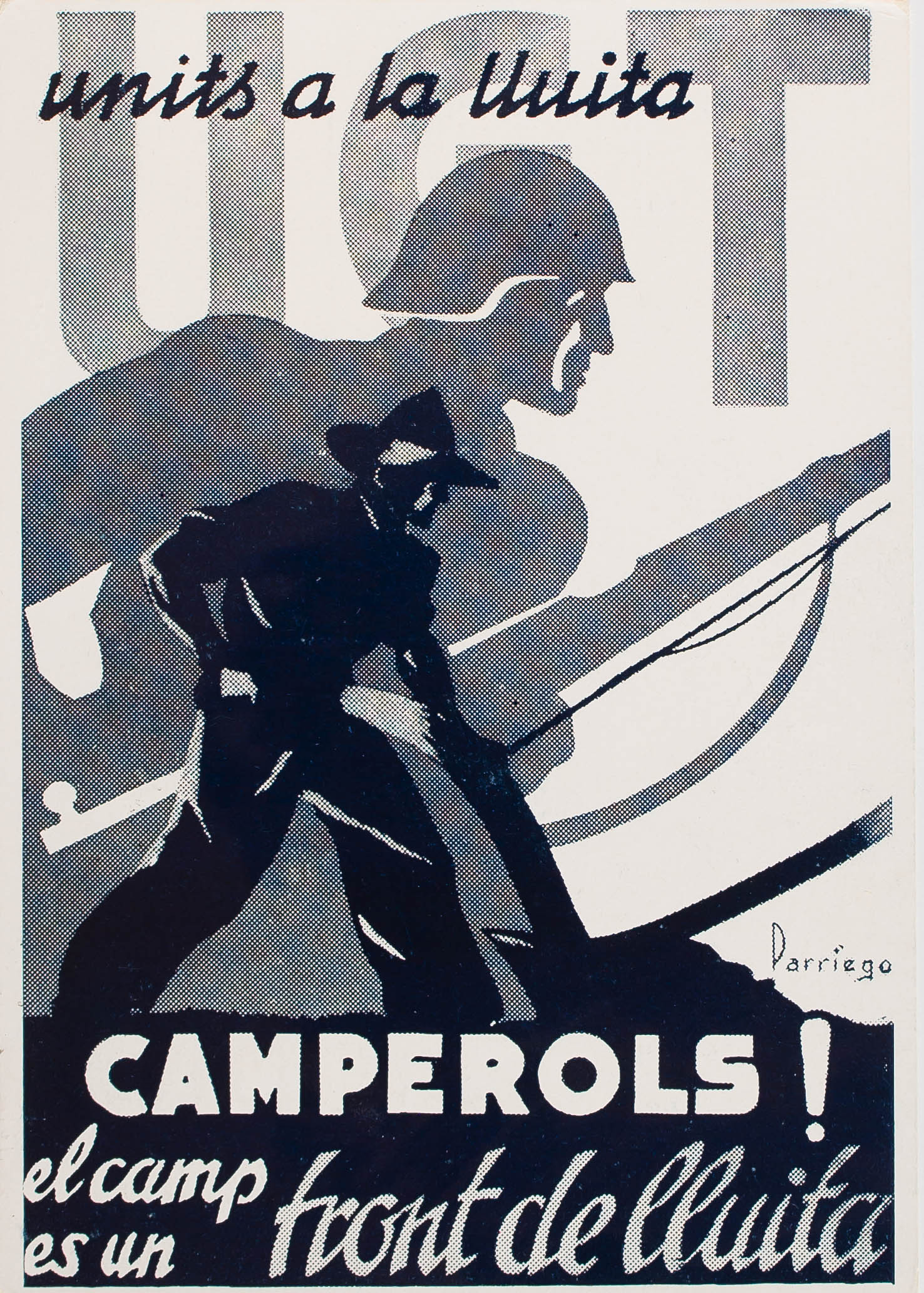 (1937ca). Tarjeta Postal Ilustrada Serie A-Nº7 del COMISSARIAT DE PROPAGANDA DE LA GENERALITAT. U.G.T. CAMPEROLS! EL CAMP ES UN FRONT DE LLUITA. MAGNIFICA Y RARA.