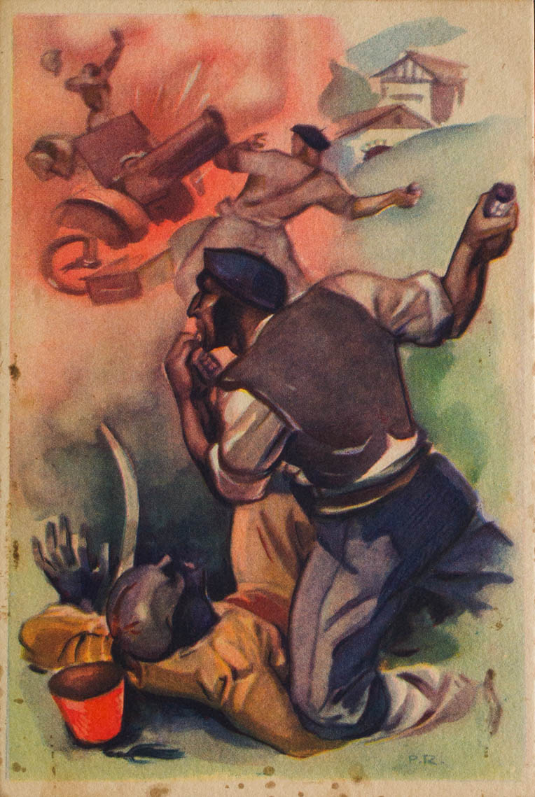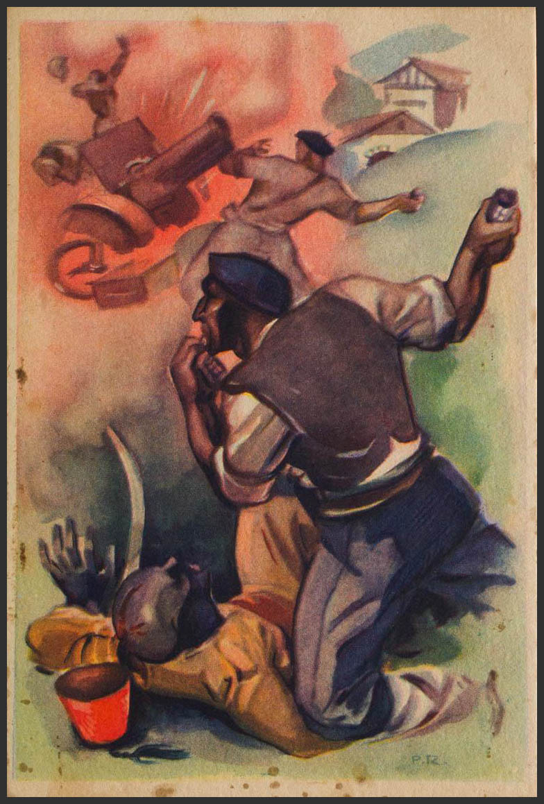 (★)(1936ca). Tarjeta Postal Ilustrada (Lucha con Tropas Bando Nacional). Departamento de Propaganda de la Delegación del Gobierno de Euzkadi en Cataluña (manchitas sin importancia). MAGNIFICA.