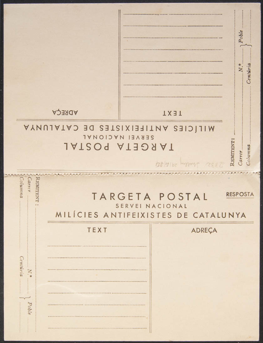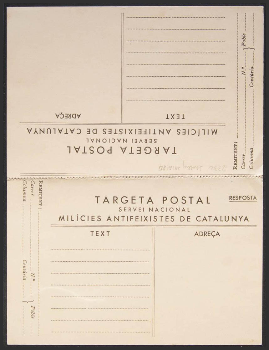 (★)(1937ca). Tarjeta Postal SERVEI NACIONAL MILICIES ANTIFEIXISTES DE CATALUÑA, de ida y vuelta. MAGNIFICA.