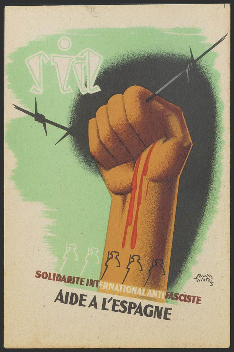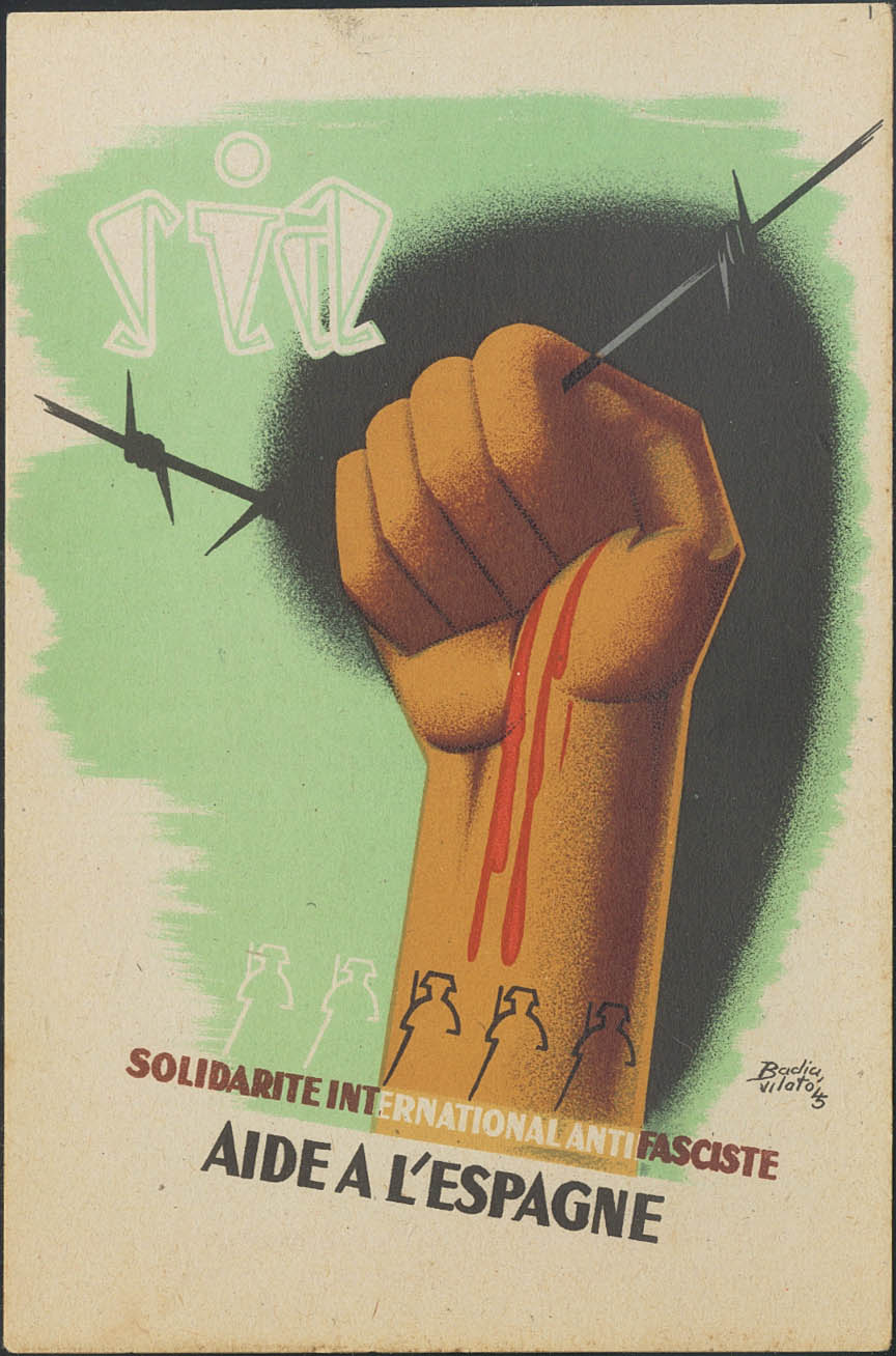 (★)1937. Tarjeta Postal Ilustrada del S.I.A. AIDE A L´ESPAGNE (Puño y Alambrada). MAGNIFICA Y RARISIMA.