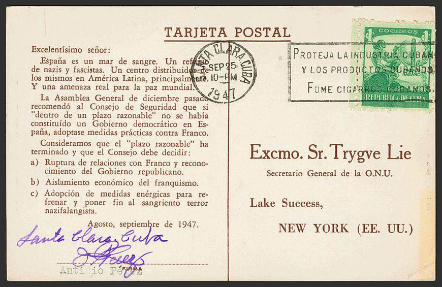 Guerra Civil. Postal Republicana. Dirigida al SECRETARIO GENERAL DE LA ONU. MAGNIFICA.