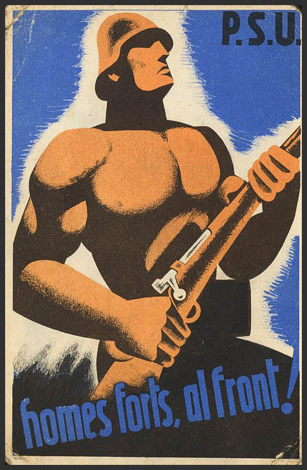 (1936ca). Tarjeta postal de P.S.U. / U.G.T. "HOMES FORTS AL FRONT". Regular conservación, aun asà magnÃfica presencia.