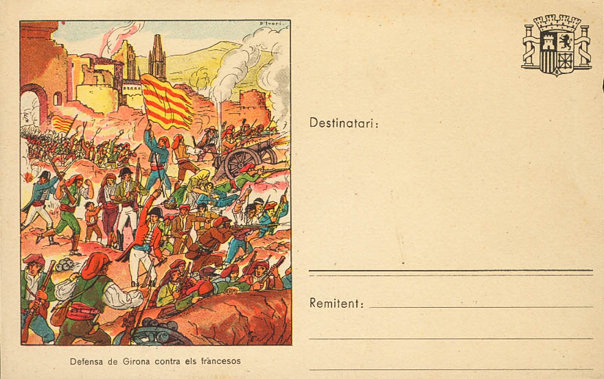 (1936ca). Tarjeta postal ilustrada con motivos polÃticos FETS HISTORICS DE CATALUNYA "DEFENSA DE GIRONA CONTRA ELS FRANCESOS". MAGNIFICA.