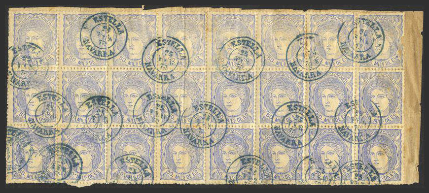 △ 107(24). 1870. 50 mils. azul, bloque de veinticuatro, sobre fragmento. Matasello ESTELLA / NAVARRA, en azul. MAGNIFICO.