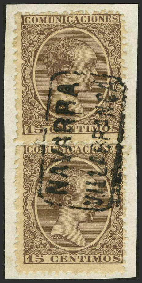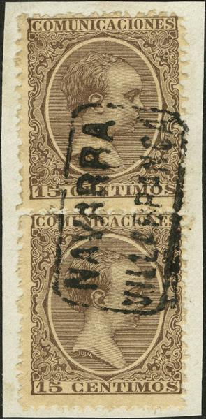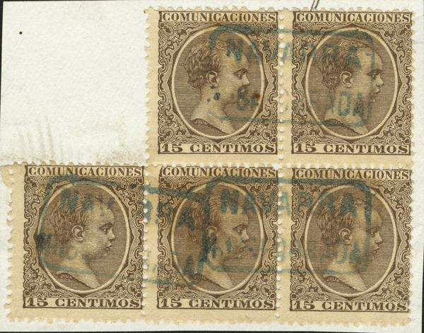 △ 219(5). 1889. 15 cts, bloque de cinco sobre fragmento. Matasello carterÃa NAVARRA / RIBAFORRADA. MAGNIFICO.