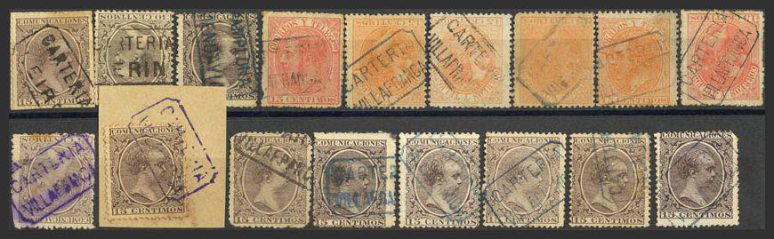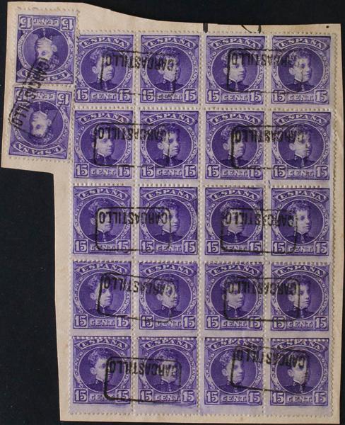△ 246(22). 1901. 15 cts violeta, veintidós sellos, sobre fragmento. Matasello carterÃa CARCASTILLO (sin texto en la parte superior, omitida la provincia Navarra). MAGNIFICO Y RARO.