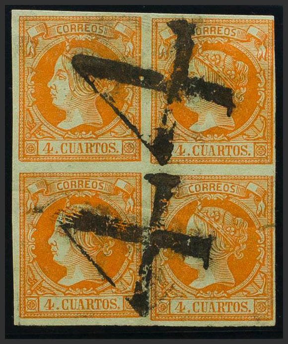 48(4). 1855. 4 cuartos rojo, bloque de cuatro (doblez entre los sellos sin importancia). Matasello ESTELLA / NAVARRA (Tipo I). MAGNIFICO Y RARO.